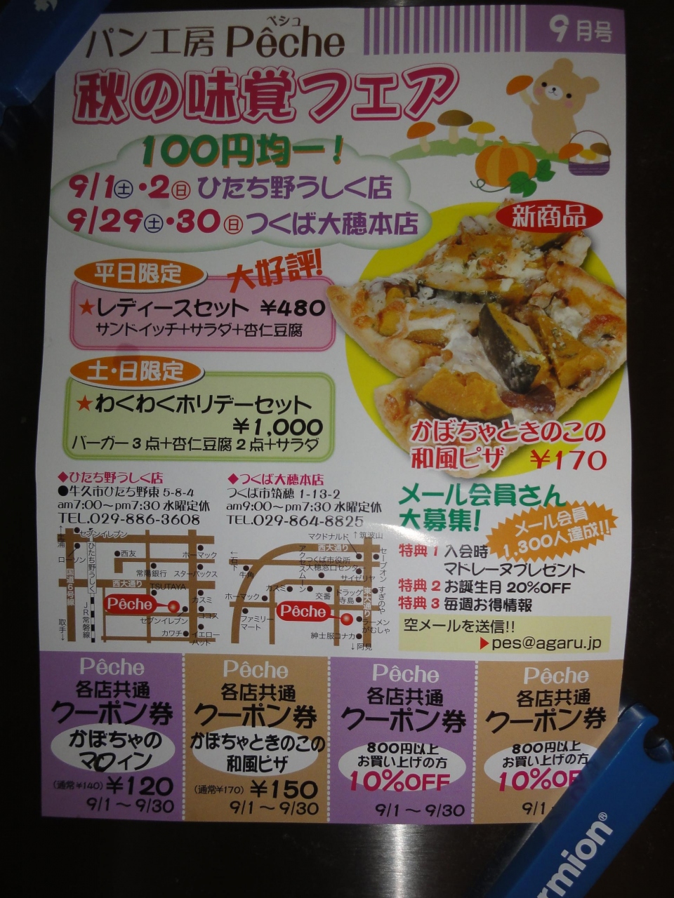 他に9月は月初めと月末の土日は¥100均一、平日限定、土日限定のお得なセットメニューもあるそうです。イベント用としては、サンドイッチを中心にオードブルやお弁当も2日前迄予約すれば作って貰えるそうです。(チラシ)