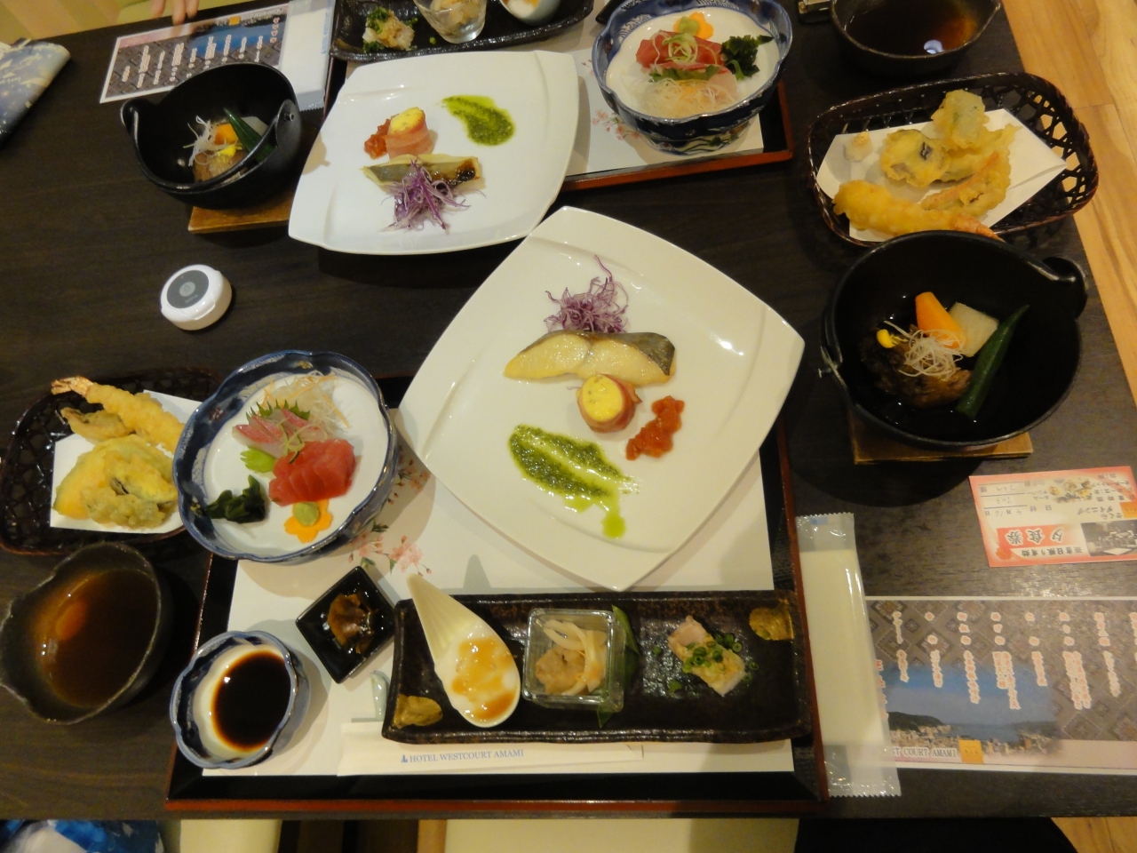 ツアーで宿泊したウェストコート奄美2階に有るレストラン、朝食の和洋バイキングもコスパ良くお勧めですが、ツアー利用の夕食も満足できました。前菜3種、お刺身、焼き物、煮物、天ぷら、生姜ご飯、味噌汁、香物、デザートのメニューでしたが、それぞれの料理に郷土の食材が使われ、味も上品でした。人手不足で飲み物注文したくとも、すぐ人が来てくれなかったり残念なこともありましたが、又行きたいと思えたレストランでした。(ツアー利用で価格は?)