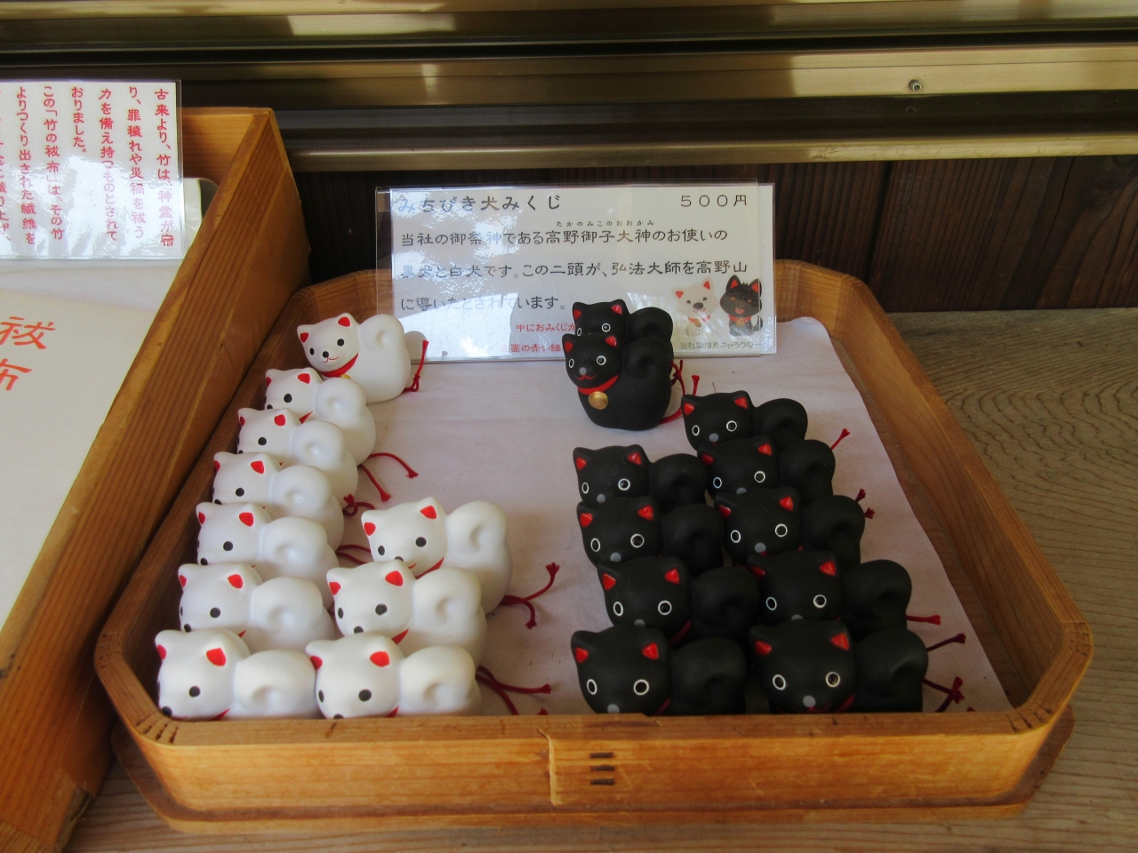 みちびき犬みくじ(500円)御祭神である高野御子大神のお使いの犬が白犬と黒犬。この二頭が、弘法大師を高野山に導いたとされ、おみくじはこの故事にちなんだものです。おみくじを取り出したあとは、お部屋に置いておくと、この「導き犬」が、仕事・勉学・恋愛などよい方向に導いてくれるそうです。2020年から白犬すずひめ号と黒犬たいき号の2頭の紀州犬が、ご神犬になりました。二頭の犬は月一で公開されるそうですが、コロナで不定期になってるようです。犬たちに会いたいのであれば、直接電話をかけて問い合わせてください。