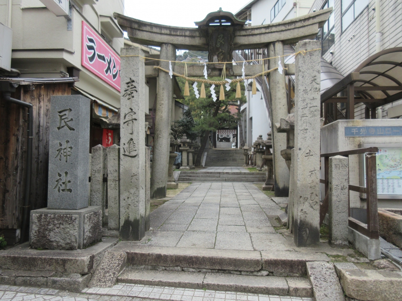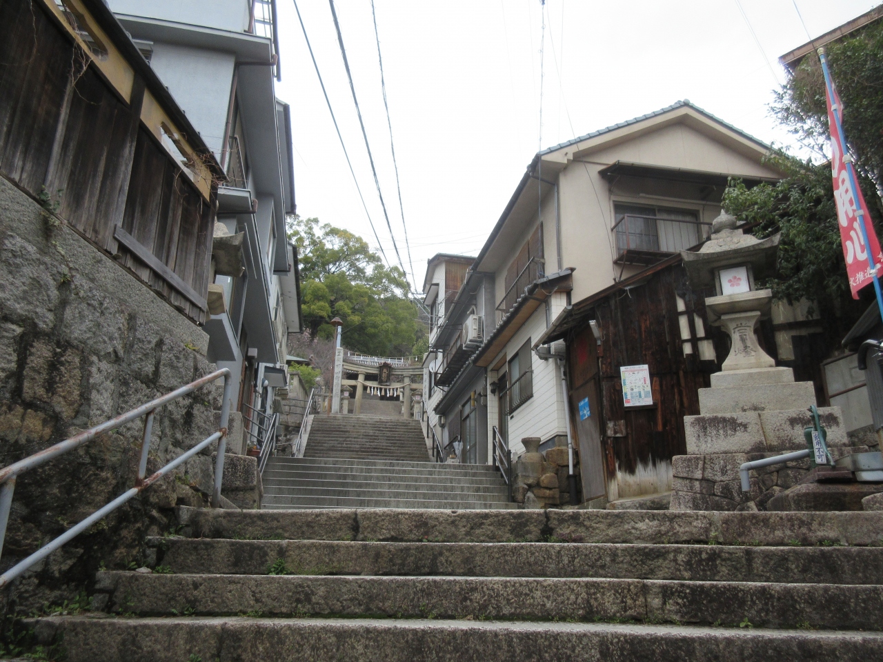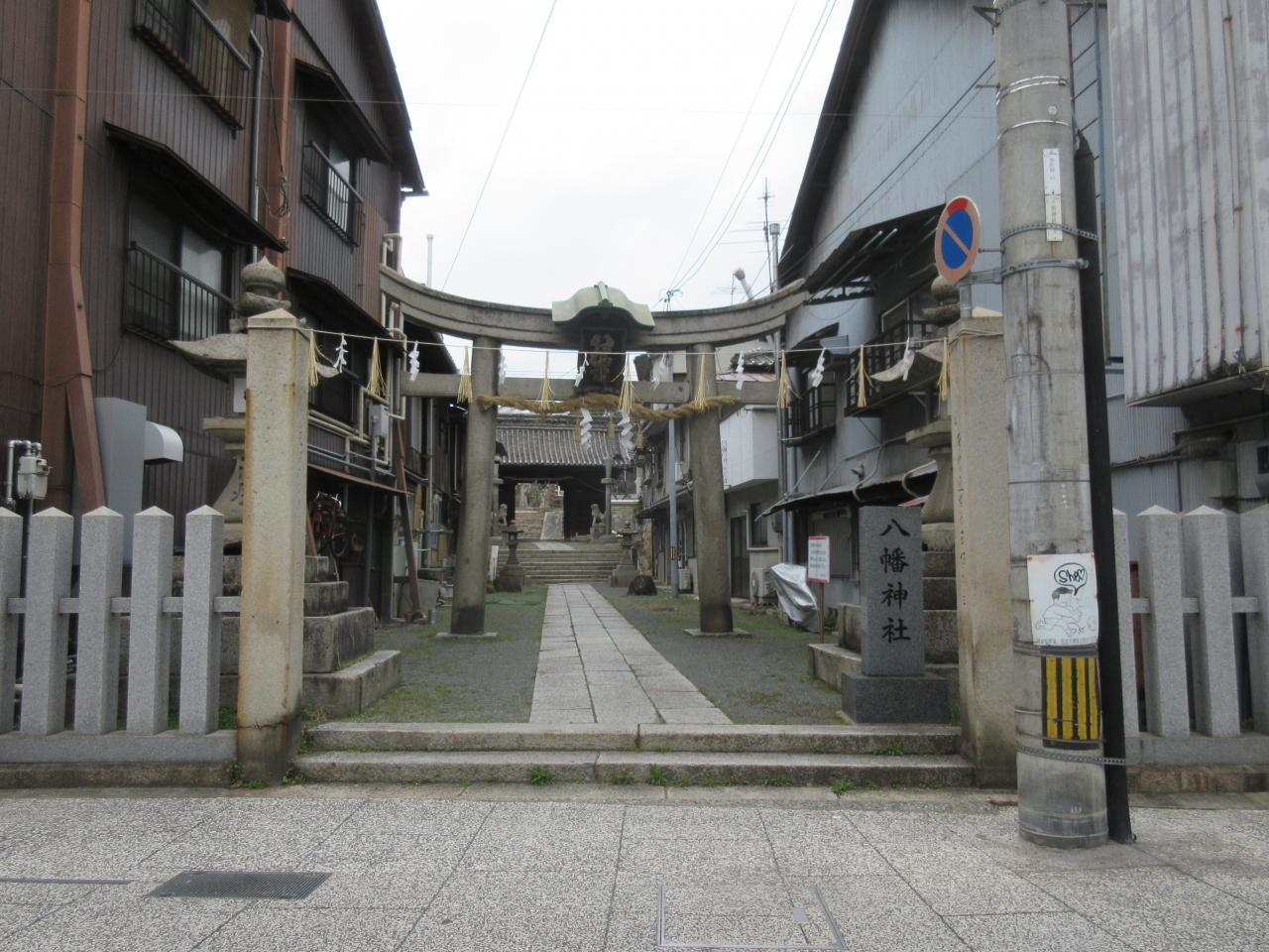 八幡神社石鳥居は久保八幡神社の鳥居です。八坂神社の北にあります。奥に随身門が見えます。尾道で一番古い石鳥居だそうです。八幡神社石鳥居から更に北に進むと目の前に国道二号線とJR山陽本線が境内を横切ってます。