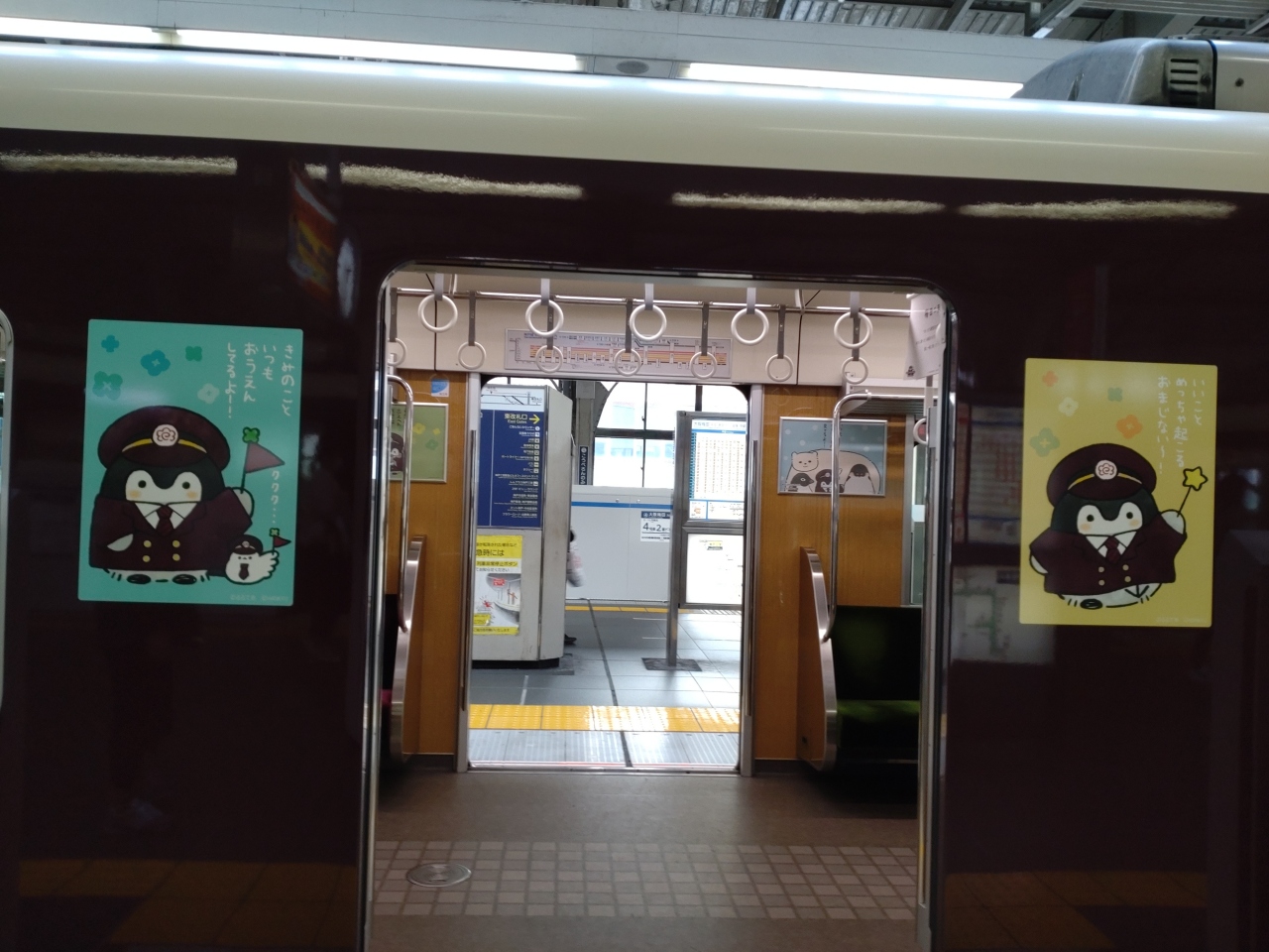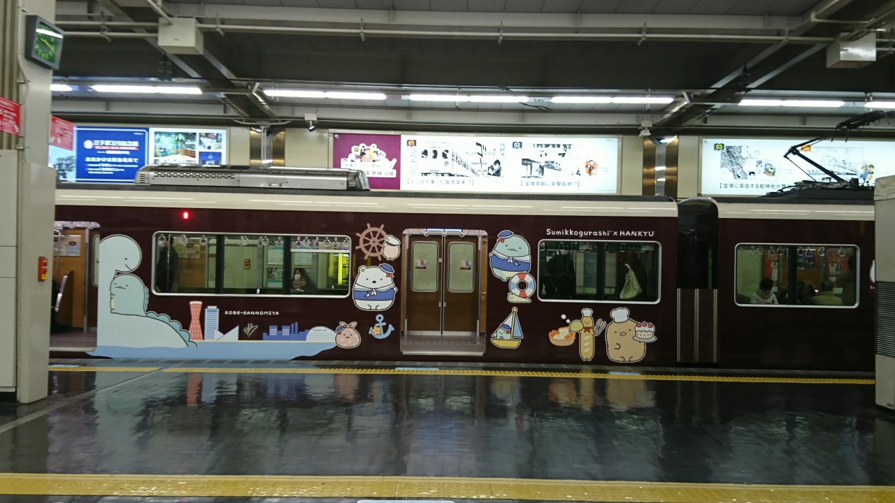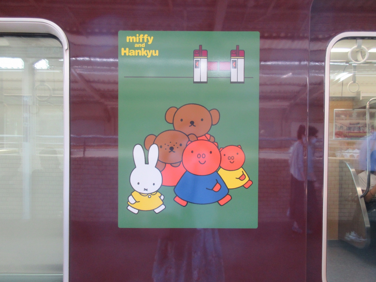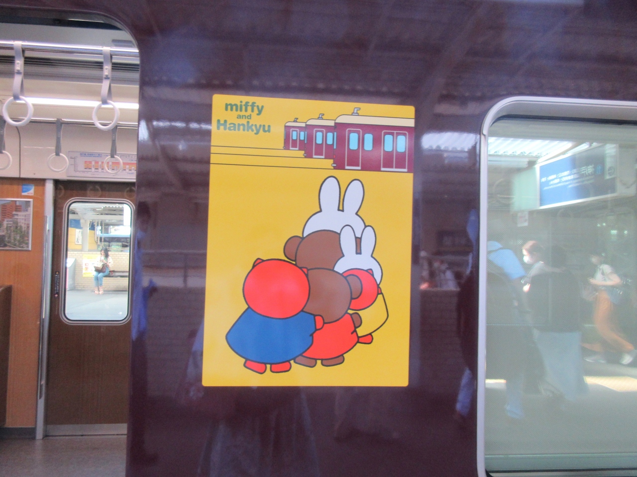 阪急電鉄神戸線の大阪梅田駅から乗車しようと7番線ホームに行くと、ミッフィーちゃんとコラボレーションした車体でした。月に一回か二回の頻度で乗るのに、乗車できて、ラッキーでした。以前は三ノ宮駅でこうぺんちゃんとコラボレーションした車両に乗れました。