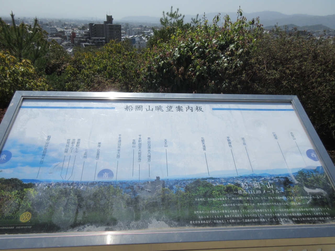 船岡山は、標高111.89メートルの山です。建勲神社と展望台と公園があります。山頂は船岡山城跡で、三角点とサイレン塔があります。展望台からは京の街が一望でき、天気がいい日は、石清水八幡宮まで見えます。