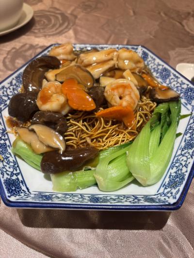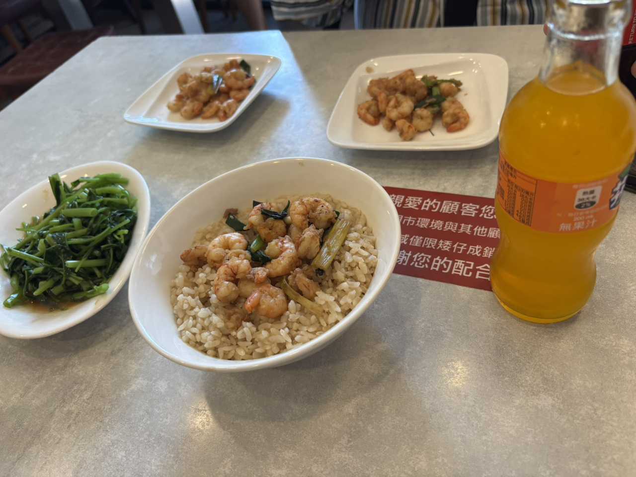 1922年の創業で、台湾の近海で採れたエビを使った料理で、ごはんの上にエビがいくつか乗ったものと、エビの炒め物(メニューには天ぷらと書かれていましたが、、)、野菜の炒め物、飲み物をオーダーしました。