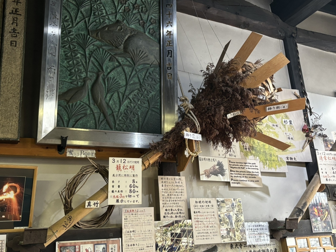 お隣にある二月堂茶所は無料の休憩所では、お水取りで使われる松明が展示してあり、その重さや大きさに驚きました。