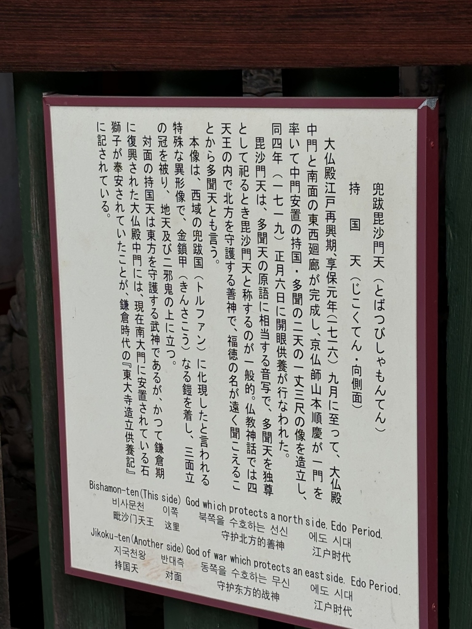大仏殿の手前にある門、仏を護る四天王のうちの持国天と兜跋毘沙門天がいます