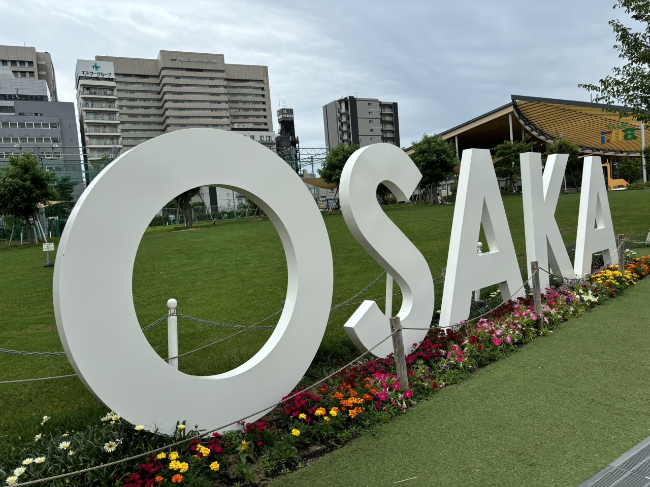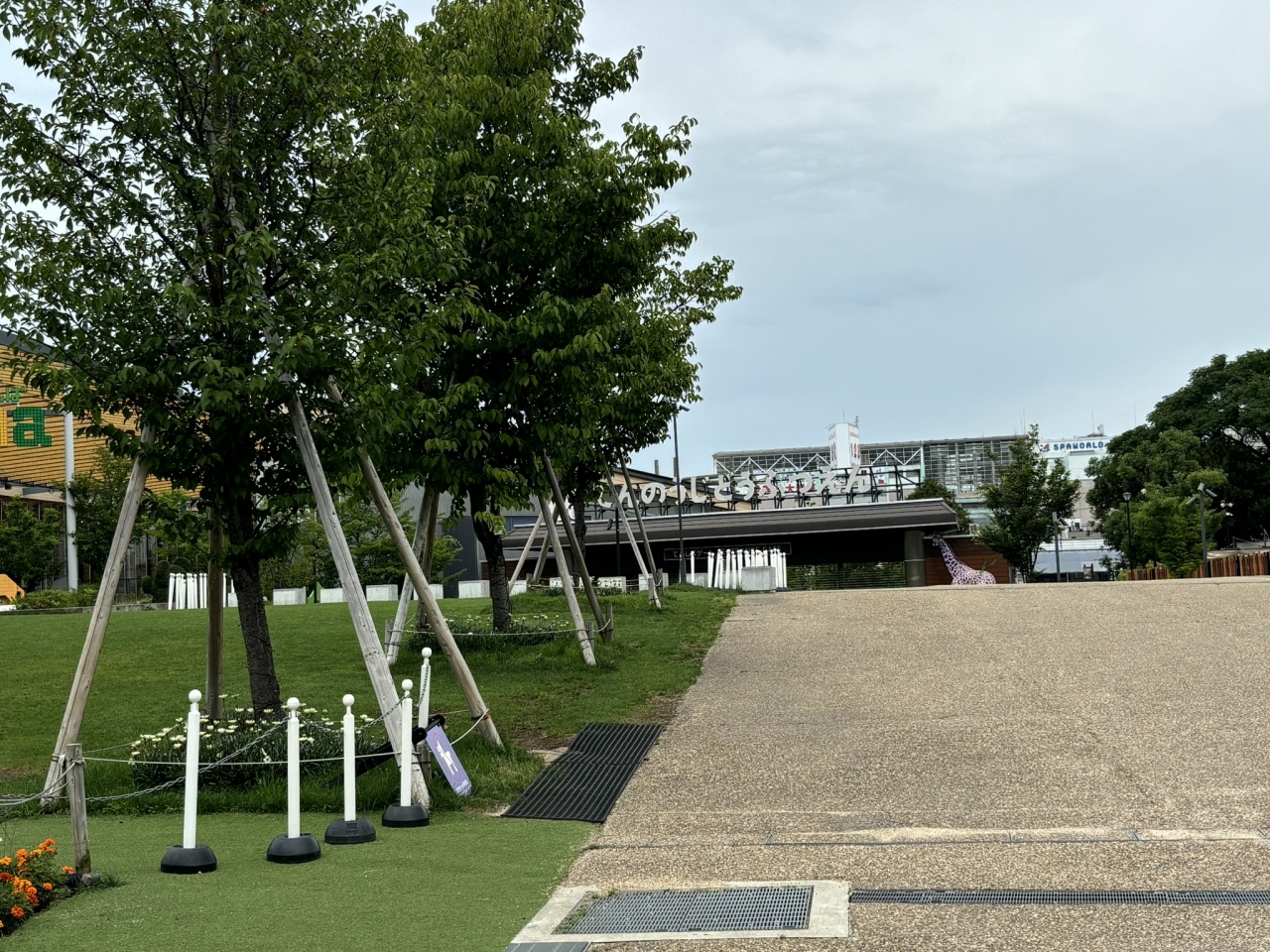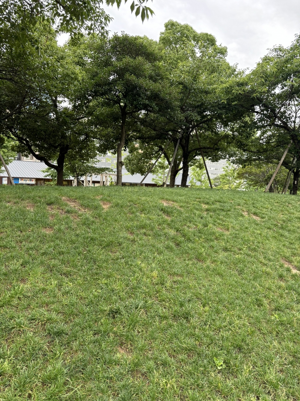 天王寺公園のエントランスのあたりには、レストランや、子供の遊び場などの建物があります。広い芝生が拡がり、とても開放的なエリアです。