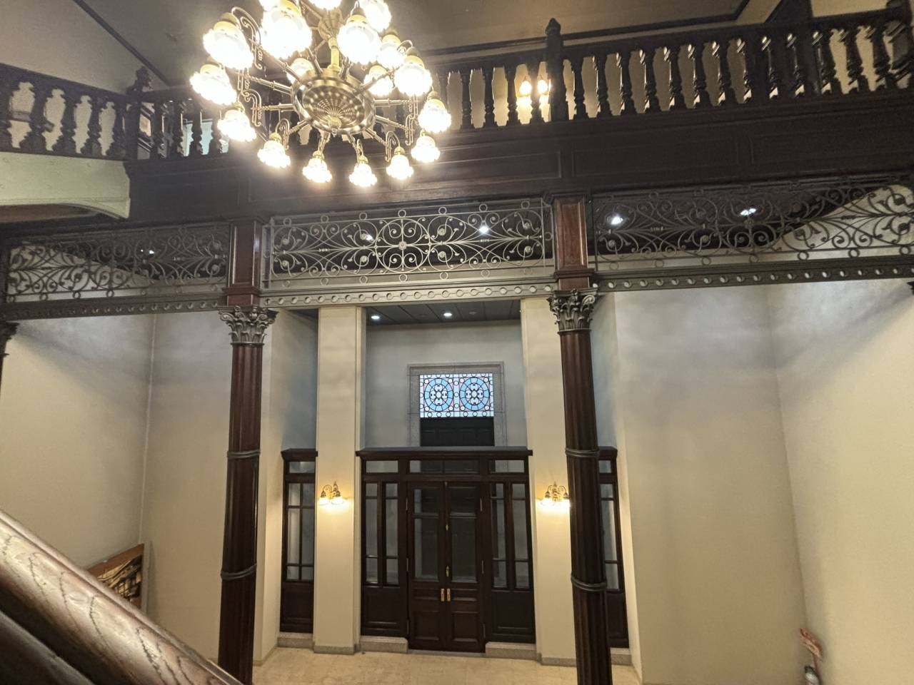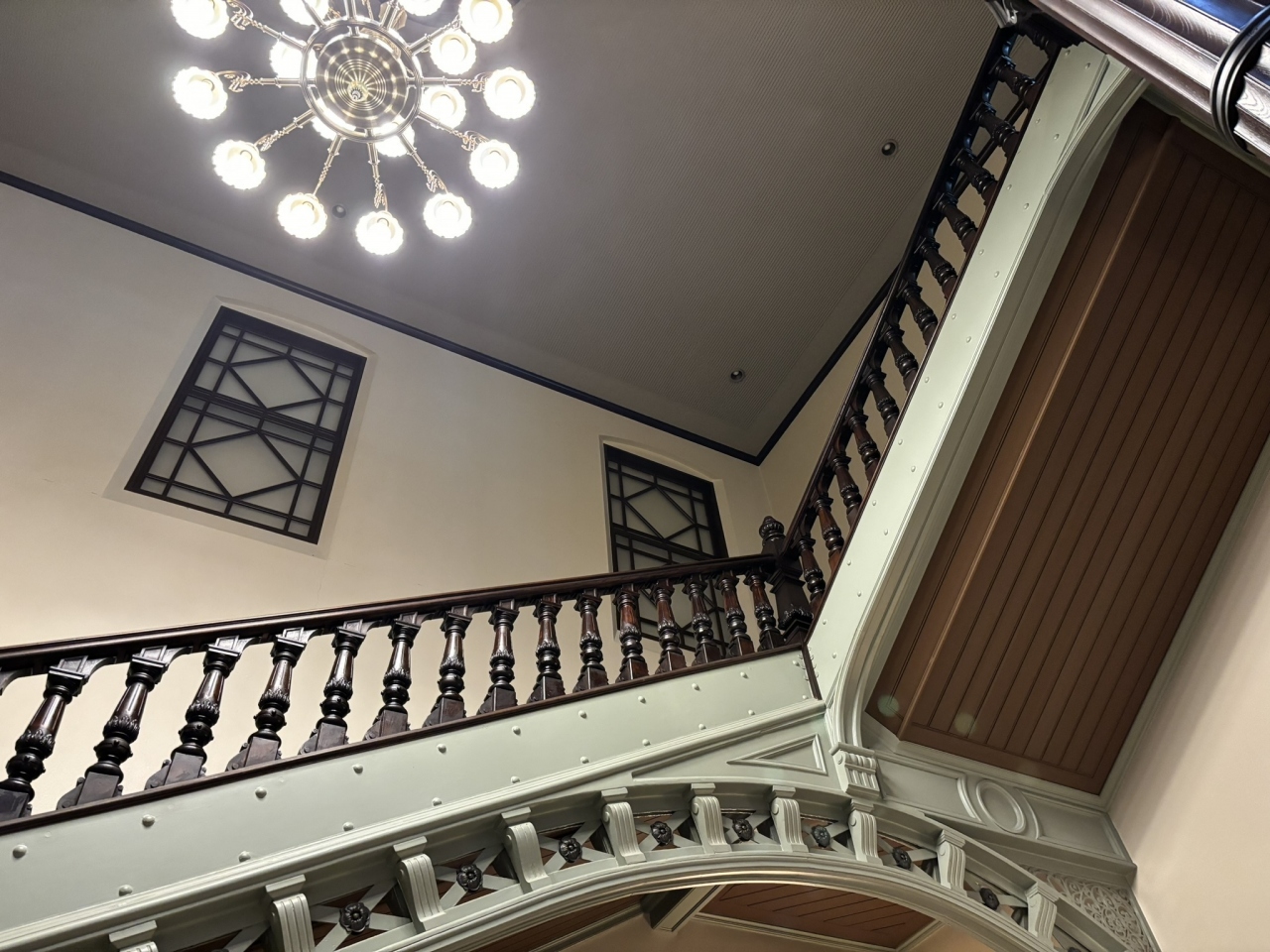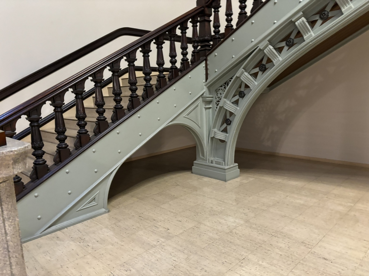 その後、階段室へ。ここは、旧舘の2階で、当時の様子をそのままに復元されていて、開館当時の玄関の様子がよくわかりました。扉も重厚なもので、ステンドグラスは天秤をモチーフにしたもので、パステルカラーの階段や手すり、飾り欄間も素敵でした。