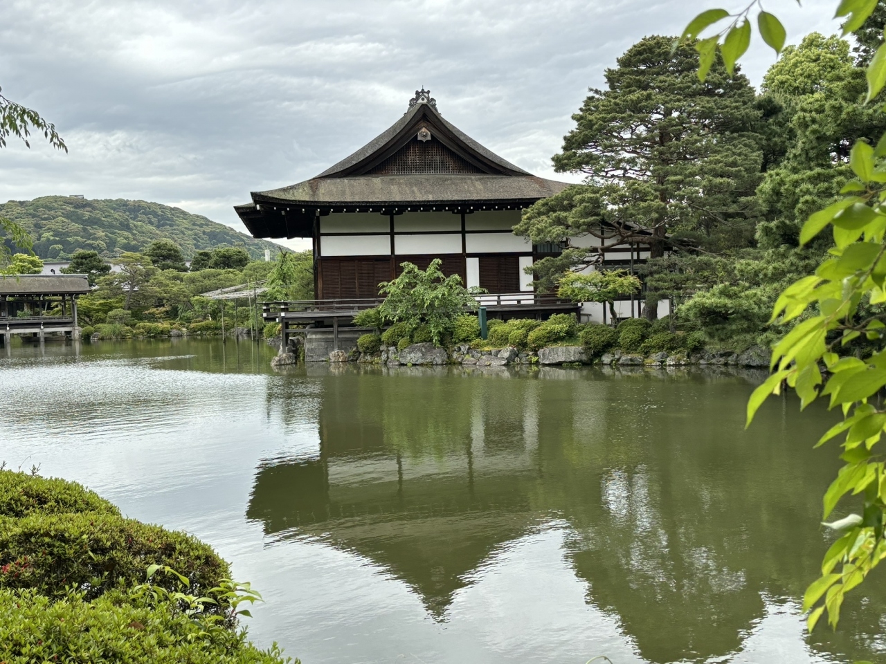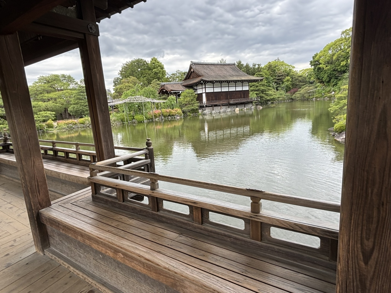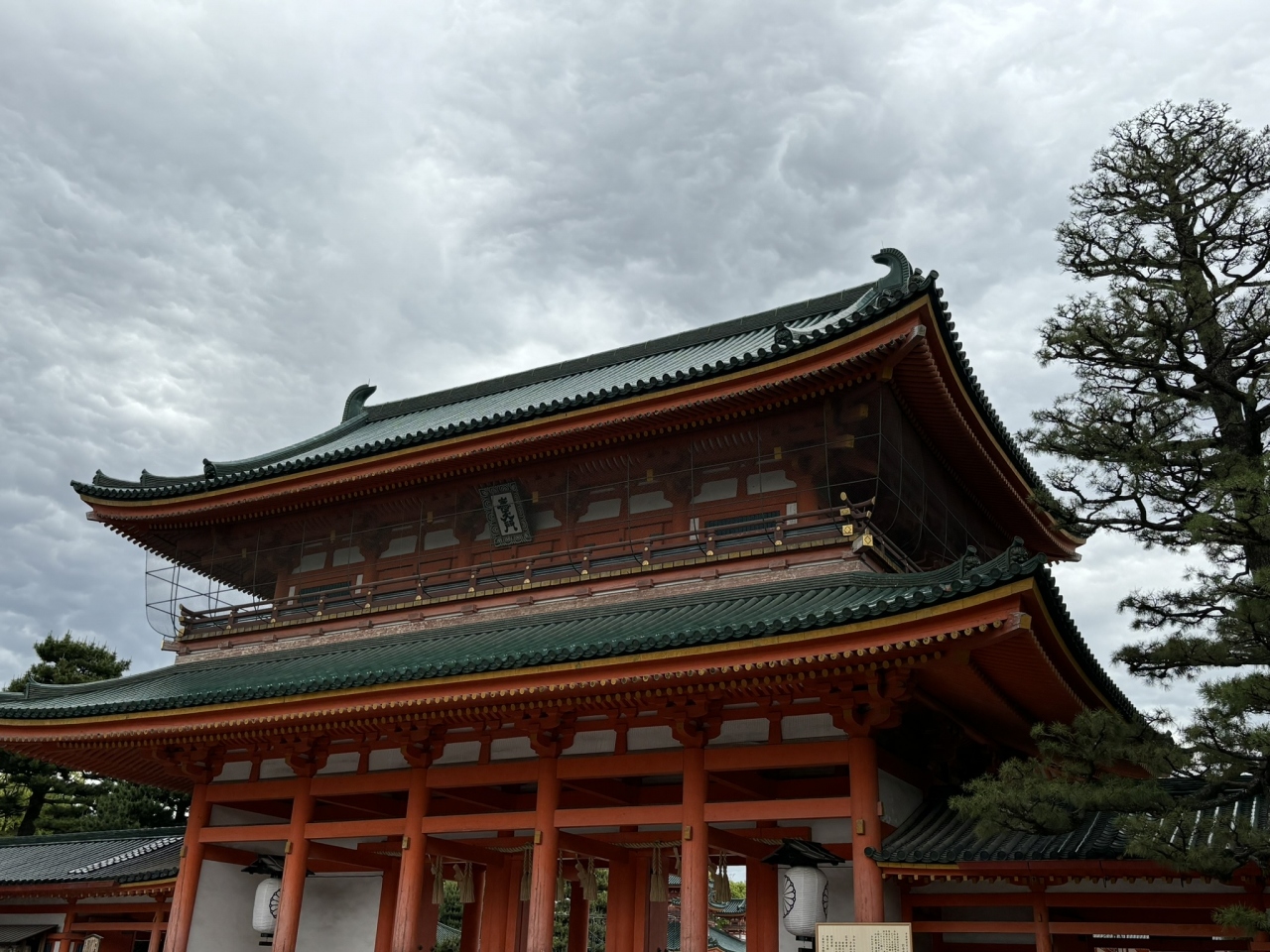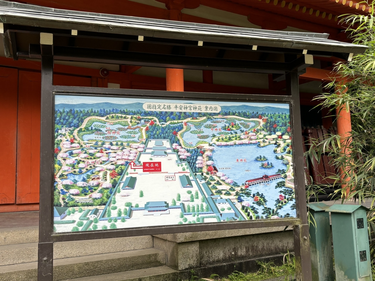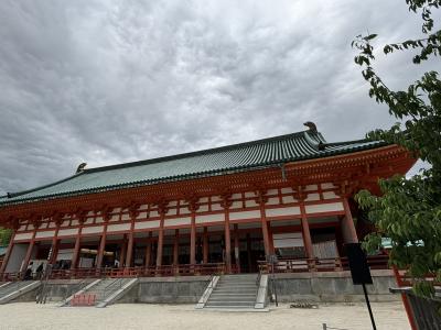 平安神宮は平安遷都1100年を記念して明治28年に創建されたもので、平安京の朝堂院を8分の5に縮小して復元され造られています。その朱色が特徴で平安の優雅な雰囲気が伝わってきます。その庭園は神苑と呼ばれ、約10000坪もある広い池泉回遊式庭園です。