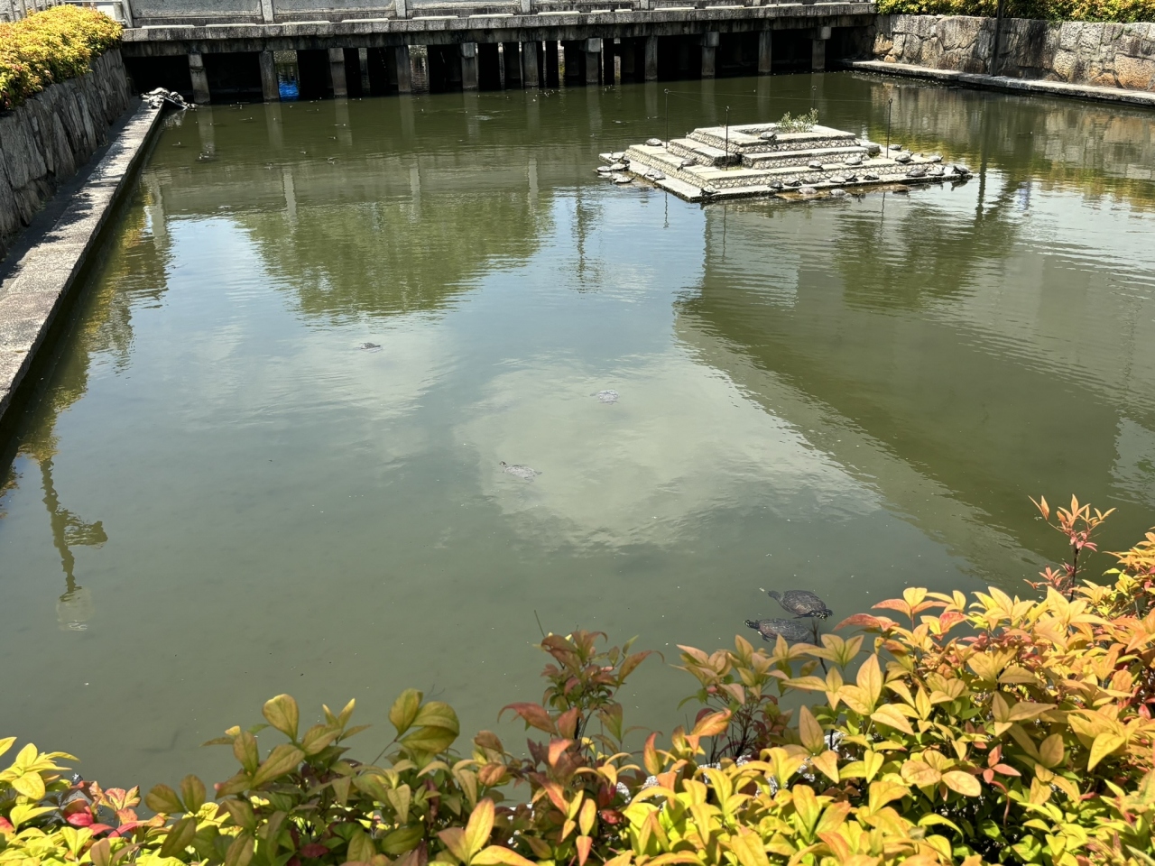 池にかかる橋は臥竜橋とよばれ、豊臣秀吉の時代の三条五城の橋脚を使って造られたもので、龍が臥した様子を表しています。