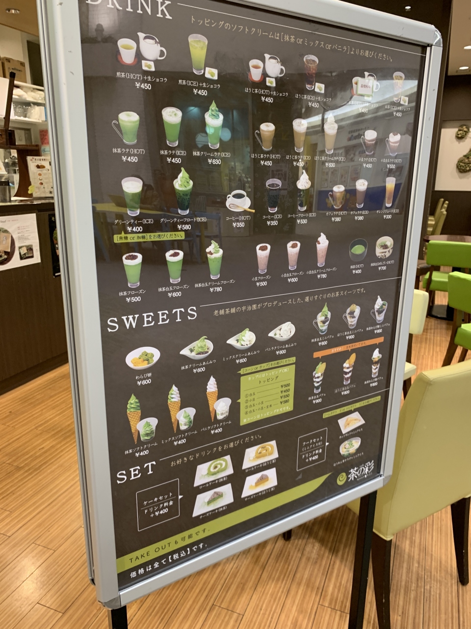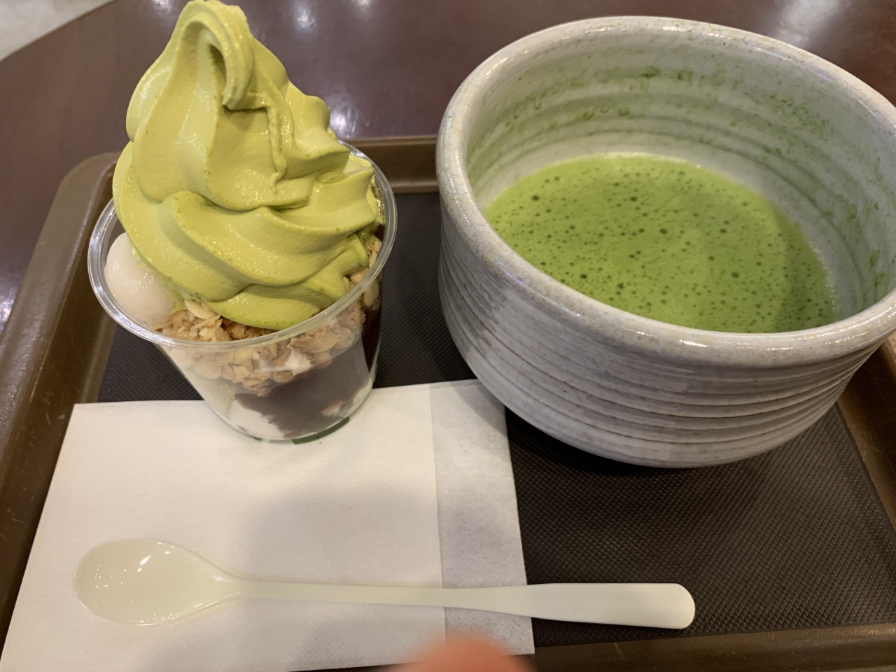 小さなパフェと抹茶を食べました。パフェは抹茶味のアイスクリームや白玉、小豆も入っており、甘さも控えめで食べやすかったです。抹茶も丁寧にいれられていて、美味しかったです。ショッピングモールの中にあり、買い物などに疲れてひと休みしたいときに、ぴったりでした。