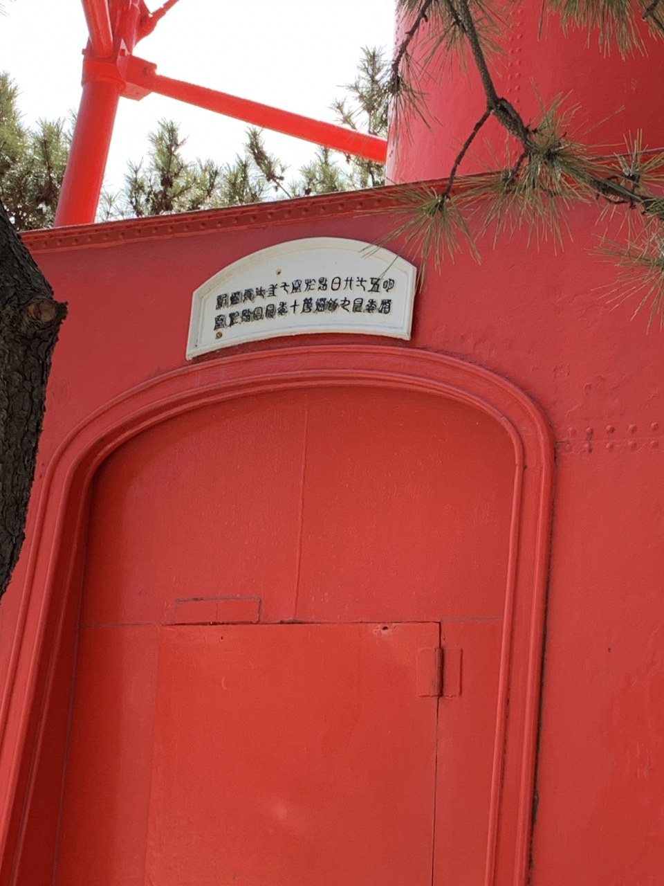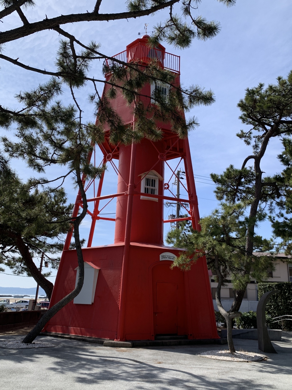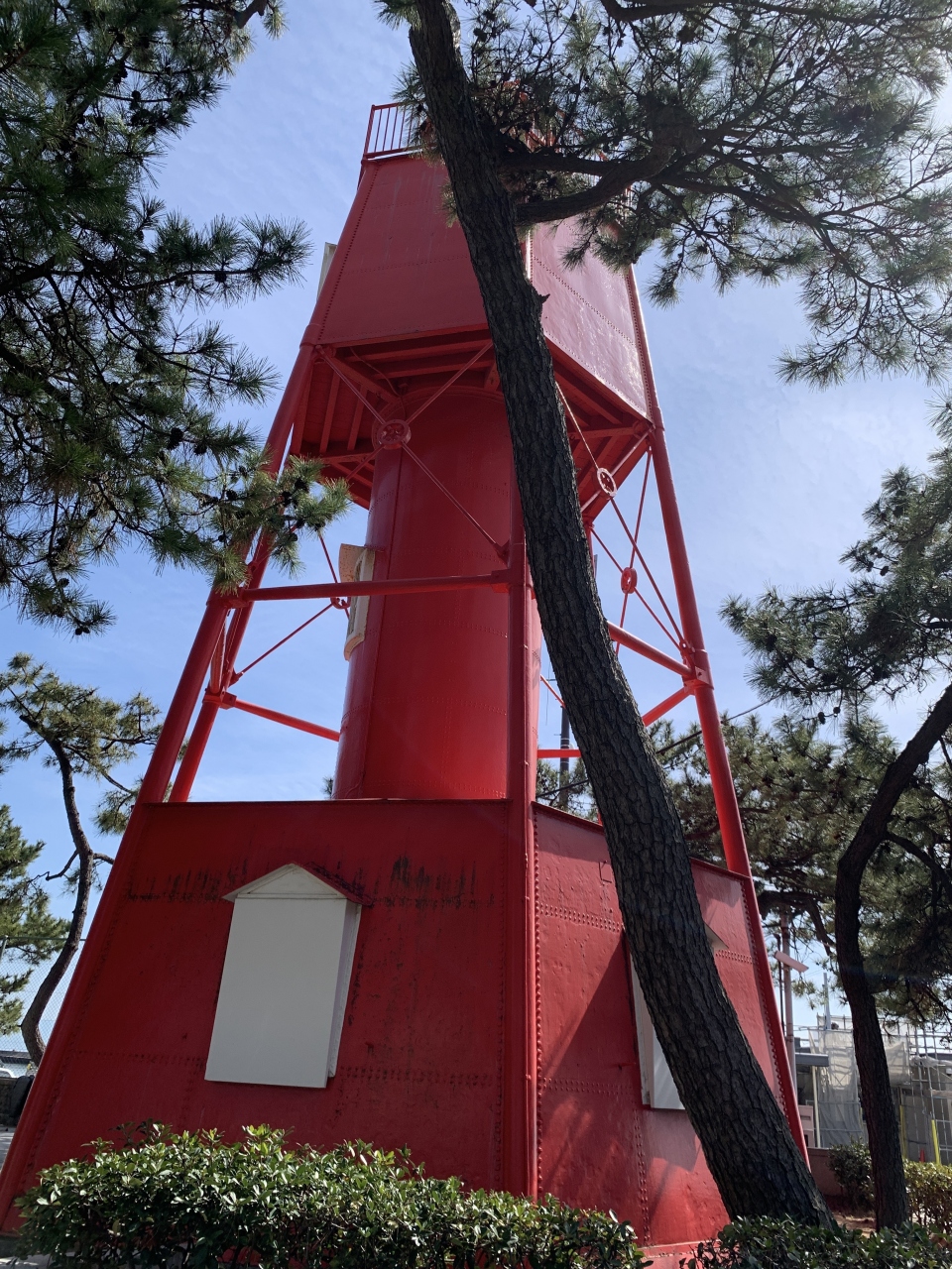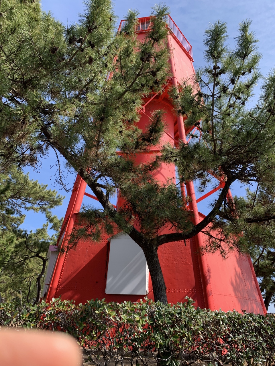 赤い色の灯台はレトロでとても可愛い様子でした。