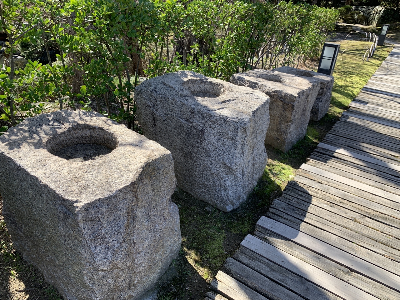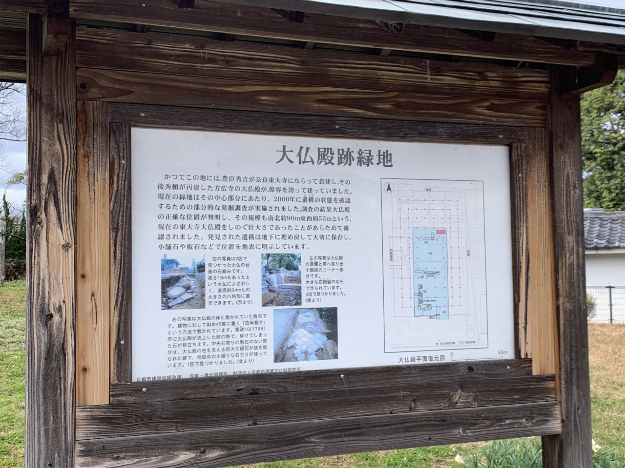復元の際の発掘調査で、橋の根元が腐らないように水面下を掘り、穴をつくり、そこに礎石を敷き、木桶のような物で囲み、橋の脚部分と板の間に粘土や砂礫で固めて、橋を支える脚の部分が腐らないような工夫がされていたようです。