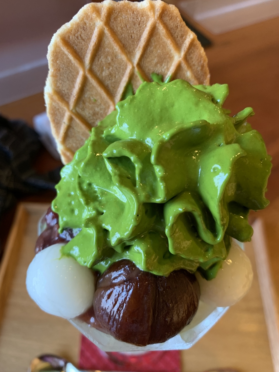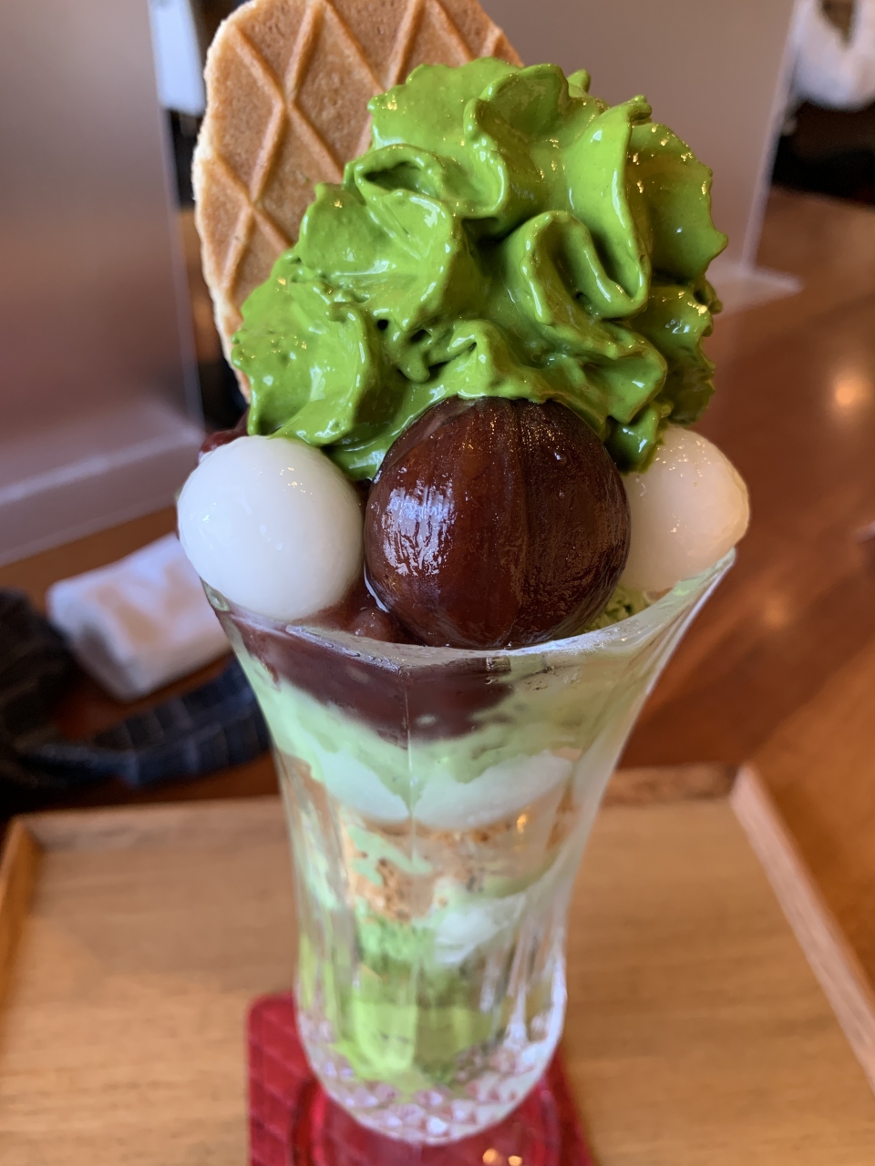 栗も乗った大きなパフェ、抹茶味のアイスクリームやクリームがたっぷりで、とても美味しかったです。お店も新しくて、清潔です。お茶やお水も置いてあり、セルフで利用できます。カレーもとても美味しいと聞きました。三十三間堂の近くにあります。