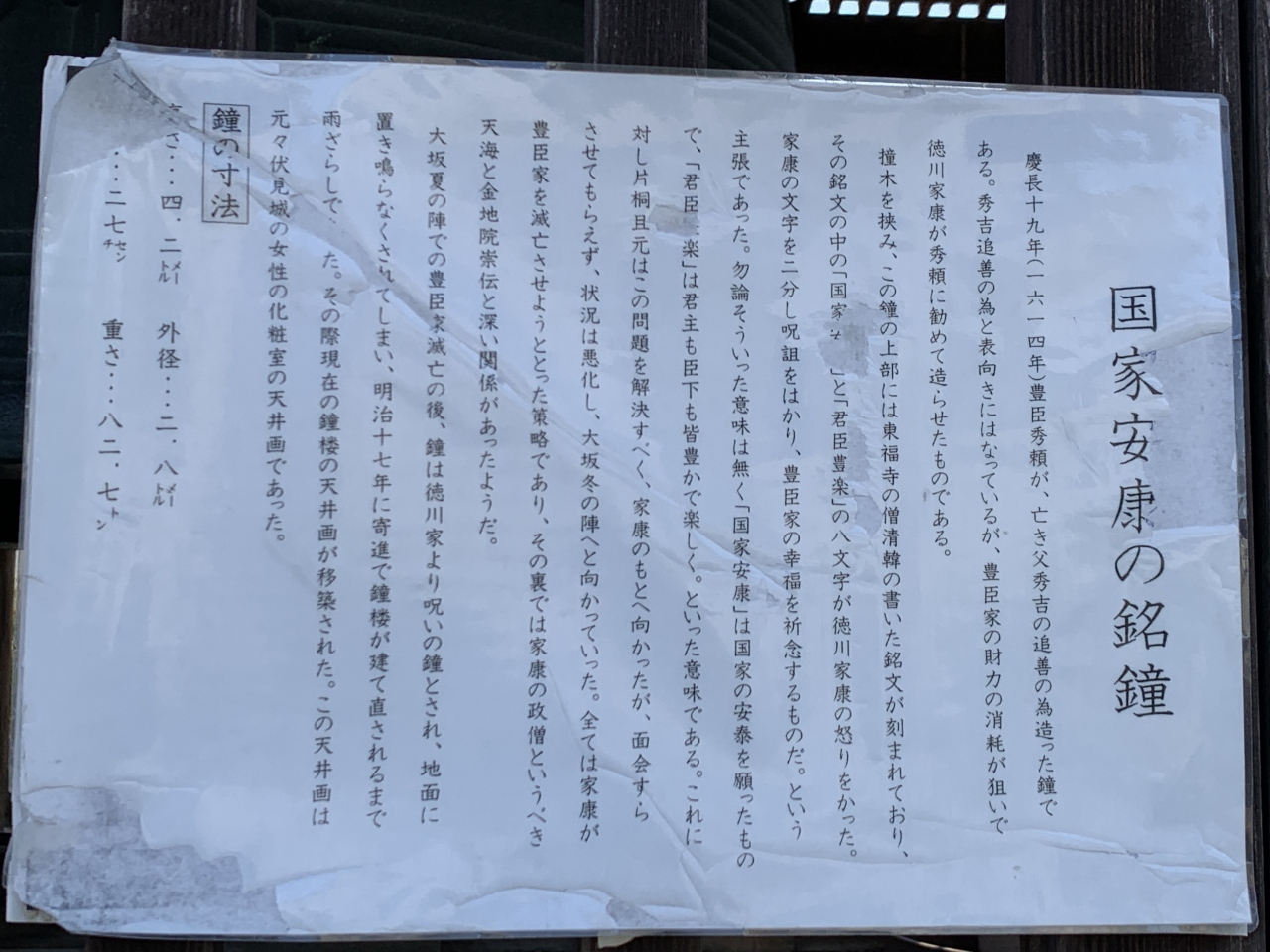 とても巨大な鐘です。「国家安康」「君臣豊楽」の文字は白く塗られ、わかりやすくなっていました。