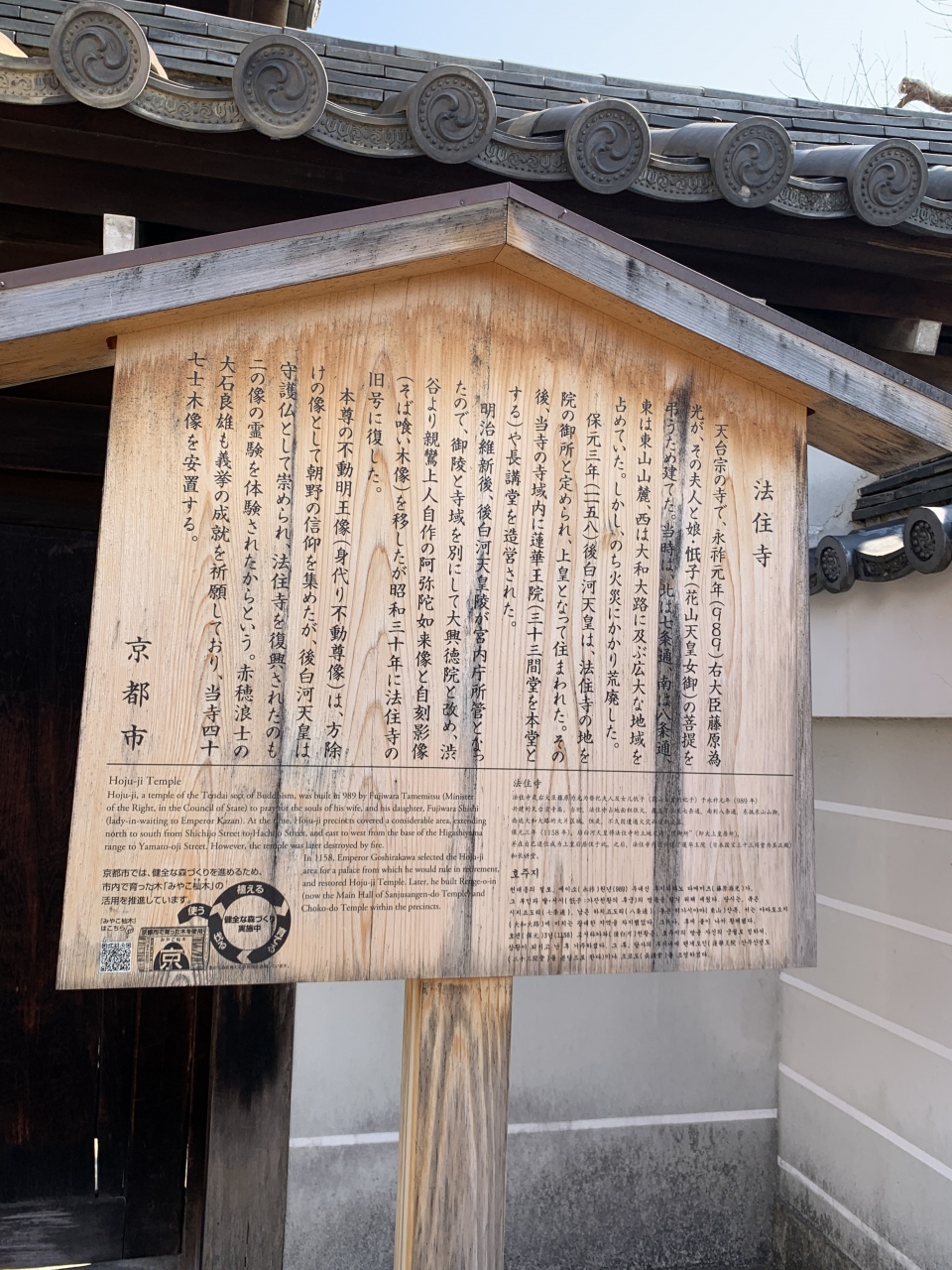 創建は988年で、藤原為光が開基です。985年に亡くなった妻、相次いで亡くなった娘の藤原忯子の菩提を弔うためでした。藤原忯子は花山天皇の女御でした。その後後白河上皇が法住寺を中心として、この土地に法住寺殿を造り、御院所としています。