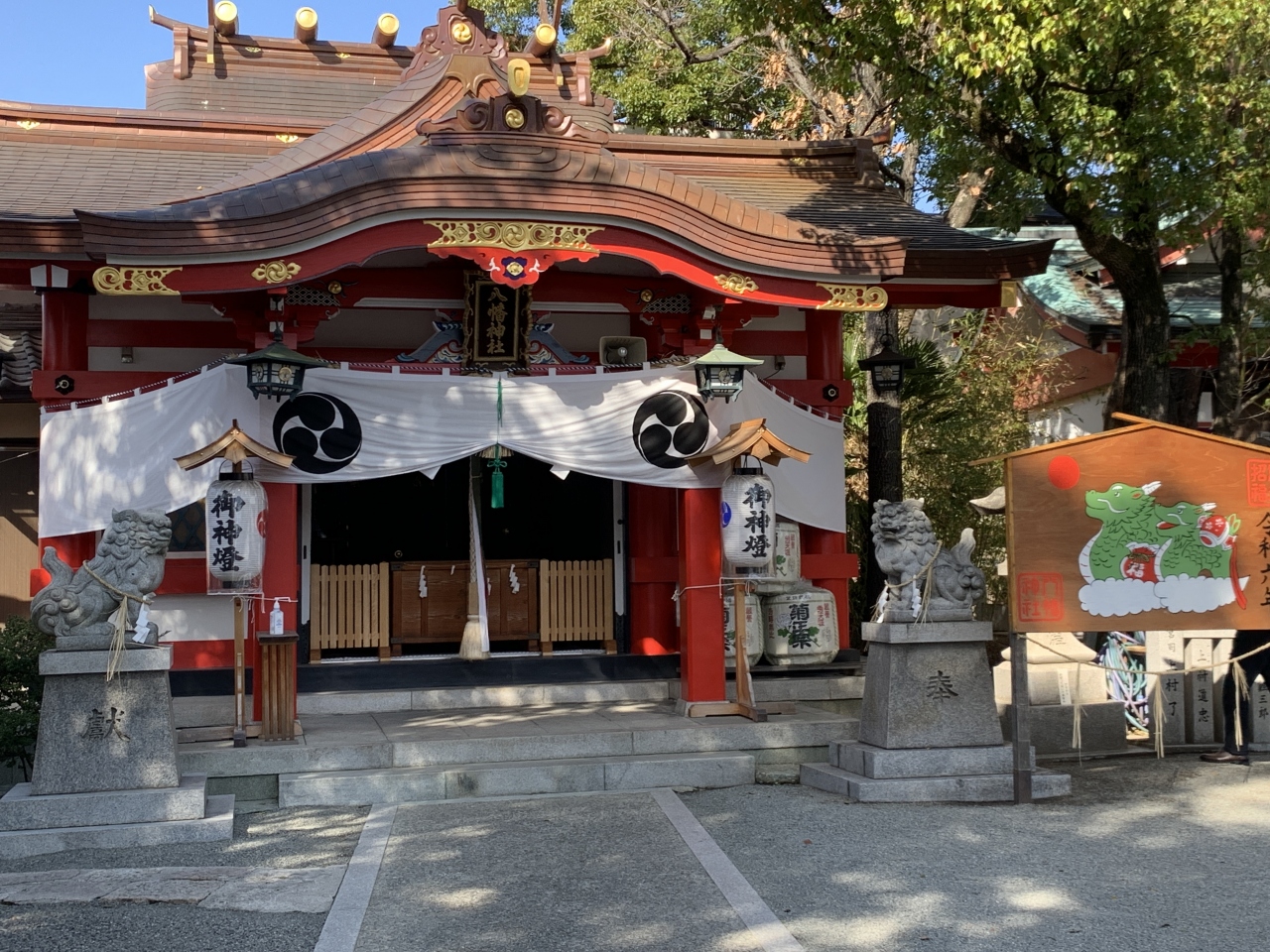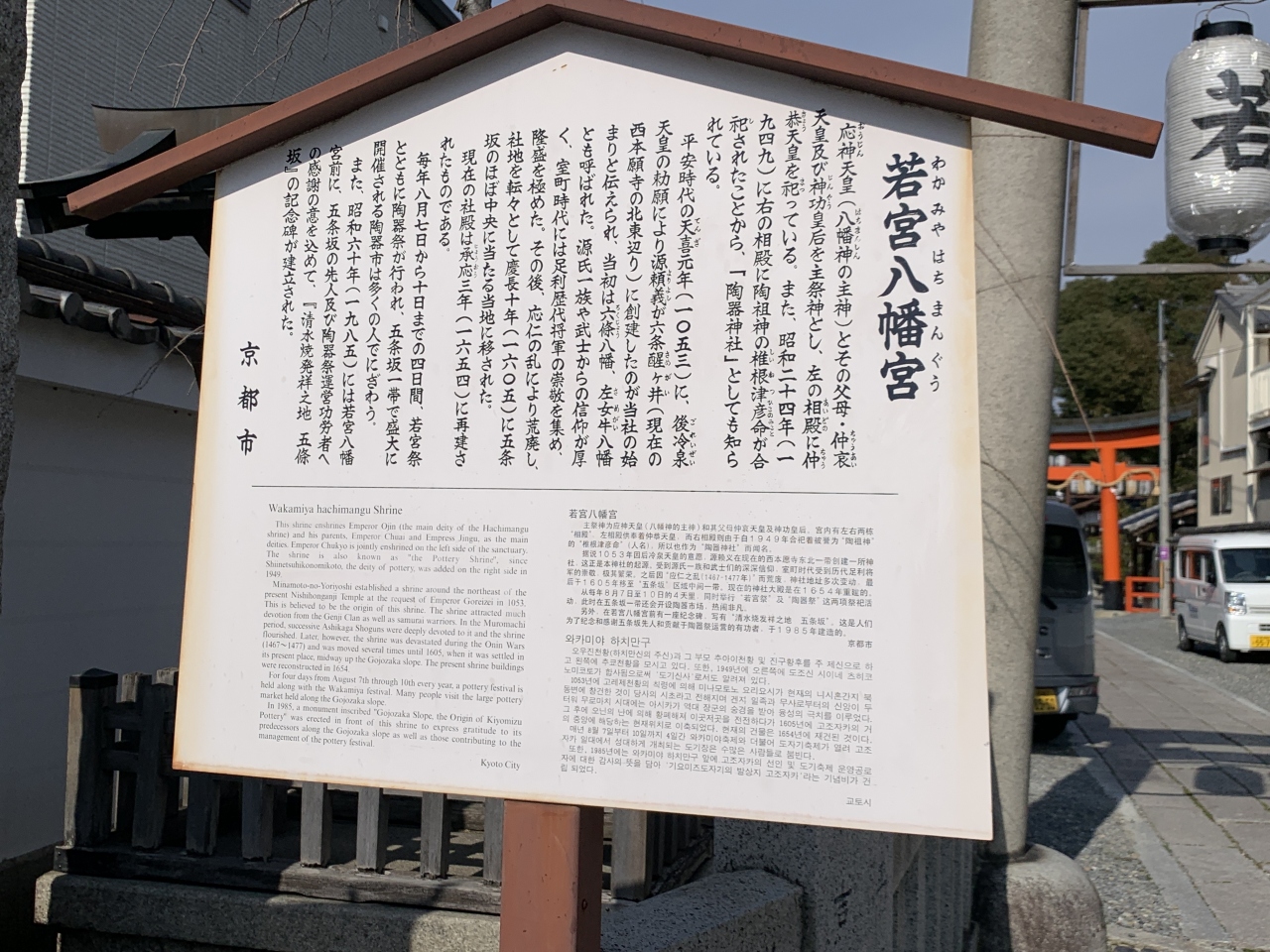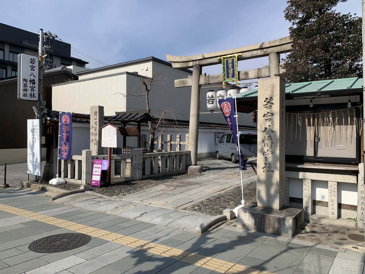 御祭神は応神天皇、仲哀天皇、神功皇后です。由緒は古く、1053年に後冷泉天皇の勅願により源頼義が六条醒ヶ井に創建したのが始まりと伝わっています。源氏や武士、足利歴代将軍らの信仰を集めてきました。その後、1605年に五条坂の真ん中あたりに移り、1654年に現在の建物は再建されています。1949年には椎根津彦命が合祀され、陶器神社となり、陶器市も開かれるようになったようです。