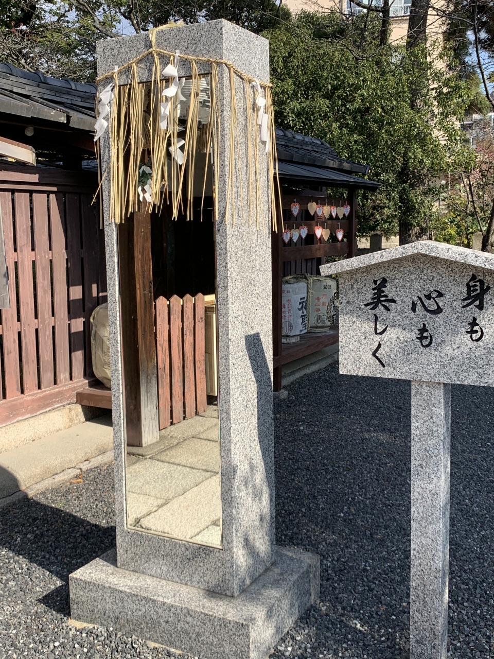 御祭神の神功皇后が美しかったといわれていることから、美人祈願の神社としても有名です。拝殿の横に鏡があります。「身もこころも美しく」と書かれていました。