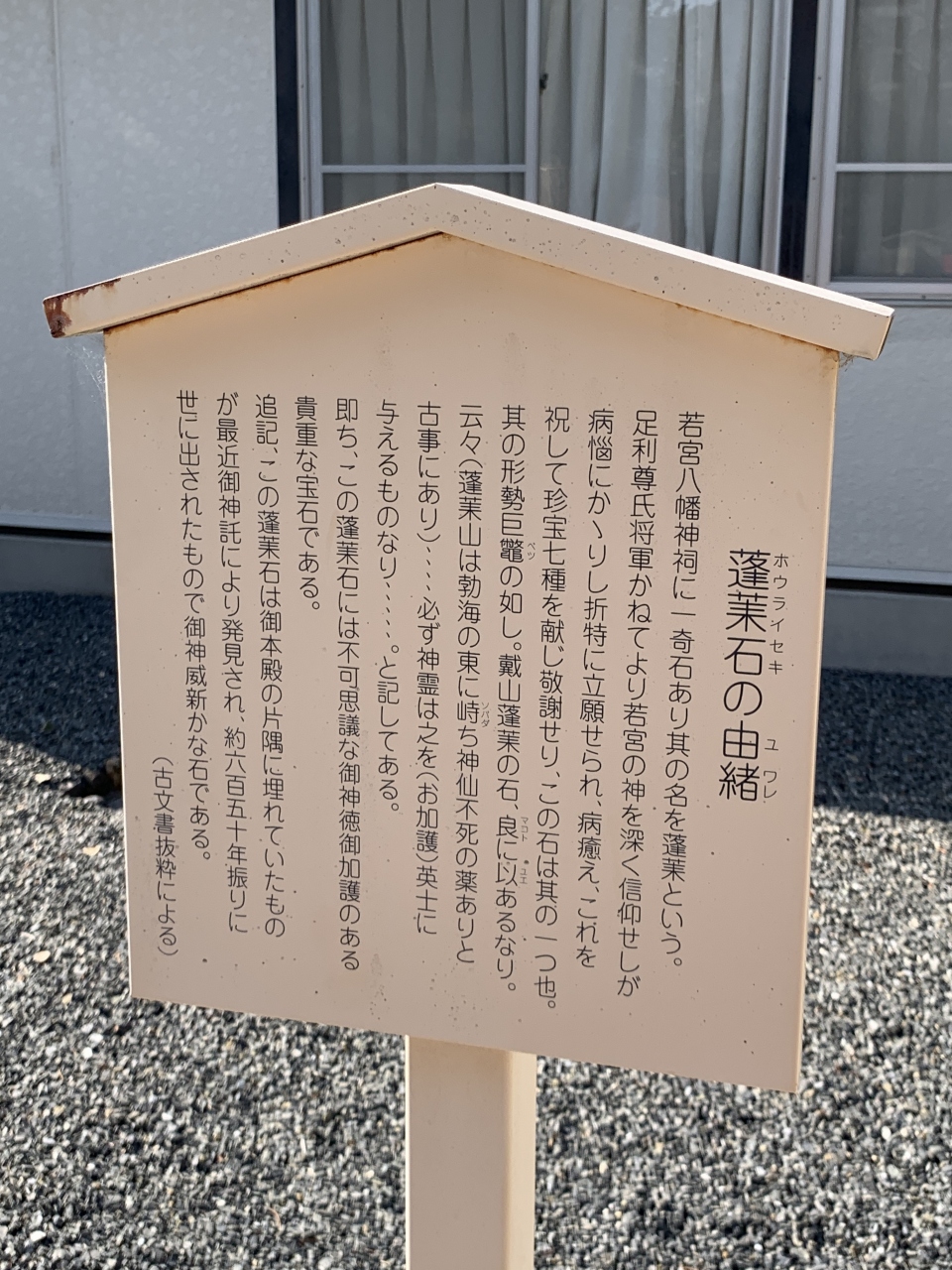 境内には蓬莱石といわれる石があり、足利尊氏の病も癒されたと伝わり、御利益があるといわれています。説明によると本殿の片隅に埋もれていたらしいですが、650年ぶりに