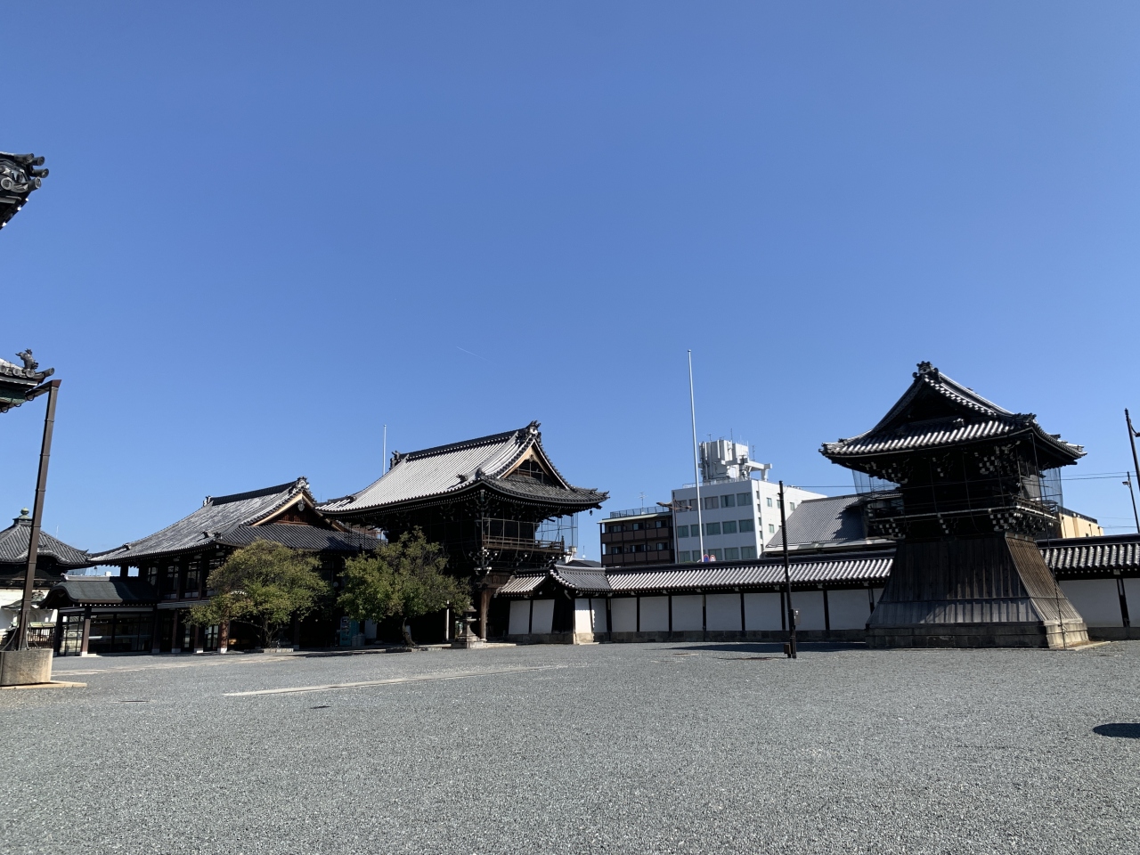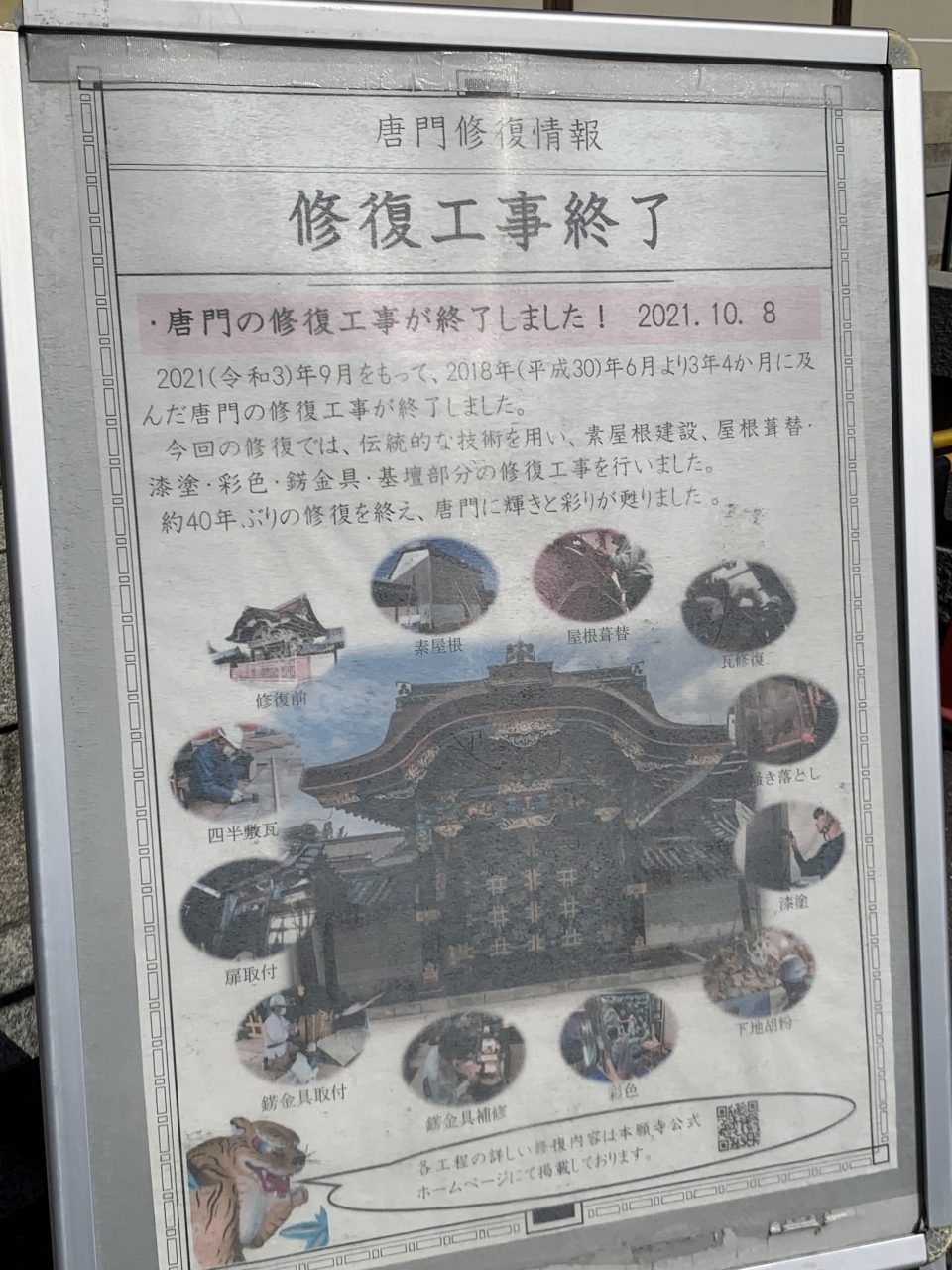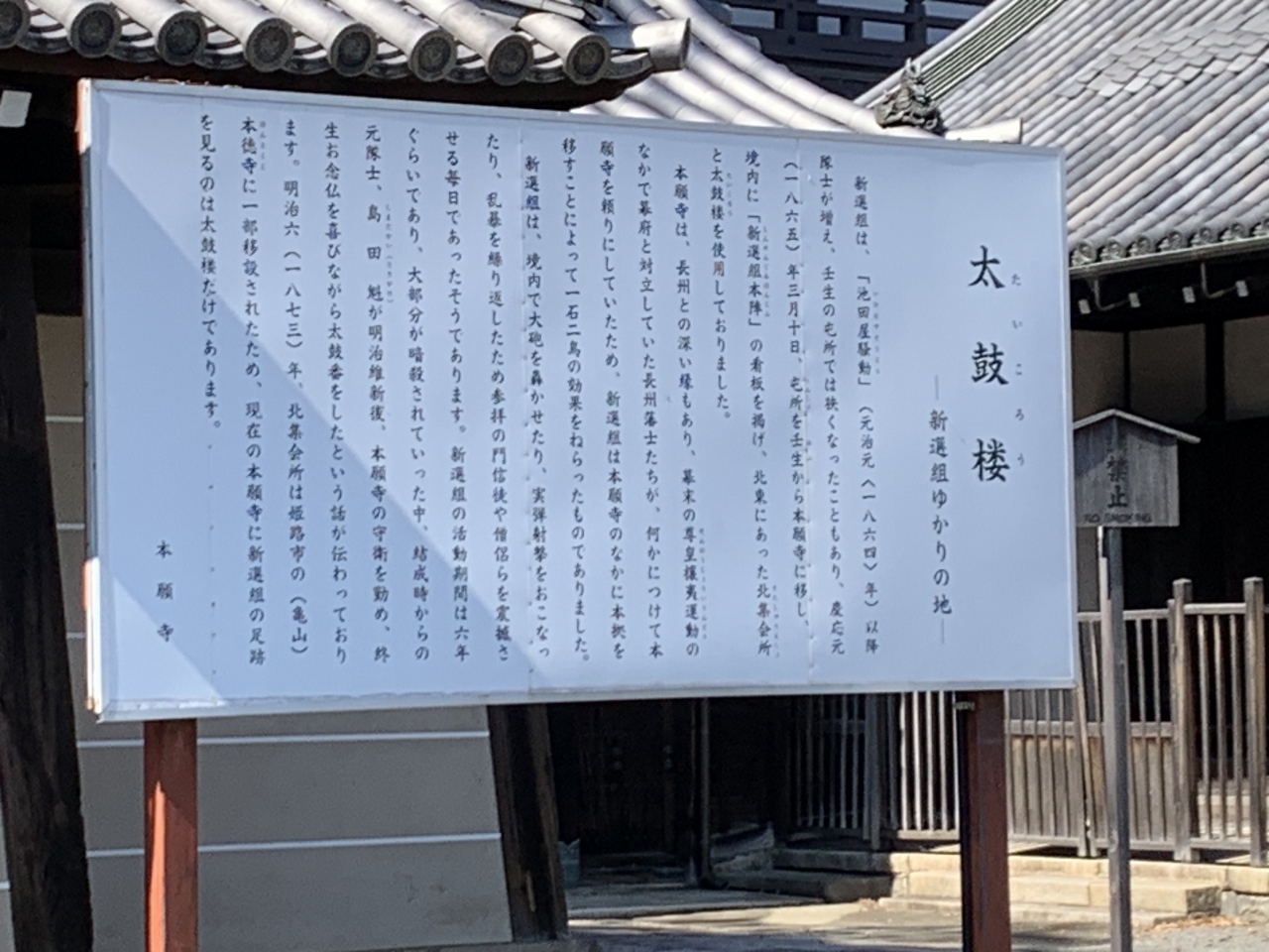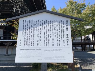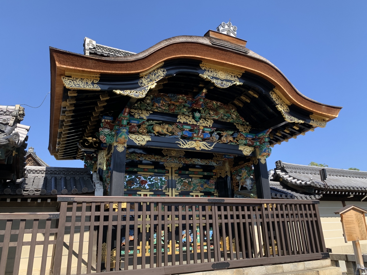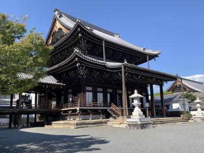 境内は広く、国宝や重要文化財の建物が連なっています。歴史は親鸞聖人が亡くなったあと、娘の覚信尼が御影堂を建てたことが始まりで、1591年には豊臣秀吉の土地の寄進を受け、阿弥陀堂や御影堂などの建物が造られています。京都では「おにしさん」と呼ばれて親しまれています。開放的で、落ち着いた雰囲気は変わらず、ゆっくりと拝観できました。修復された唐門も素晴らしかったです。いつまでも飽きずに観られることから「ひぐらしの門」ともいわれています。また、新選組は屯所跡がいくつかありますが、西本願寺もその一つで、説明書きもありました。
