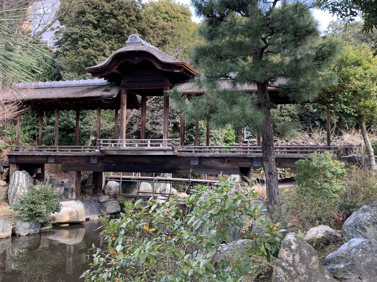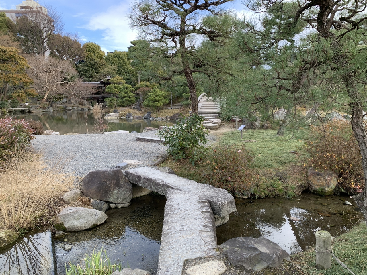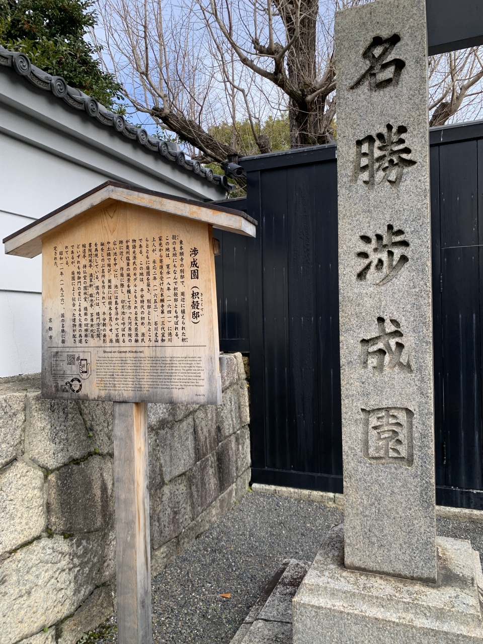 東本願寺の飛び地境内にあります。徳川家康から寺地を寄進され、東本願寺が成立しますが、家光の代にも東側の土地も寄進され、そのご宣如上人が1653年にこの場所を隠居の場所として渉成園と名付けました。池泉回遊式庭園は石川丈山の作庭といわれています。