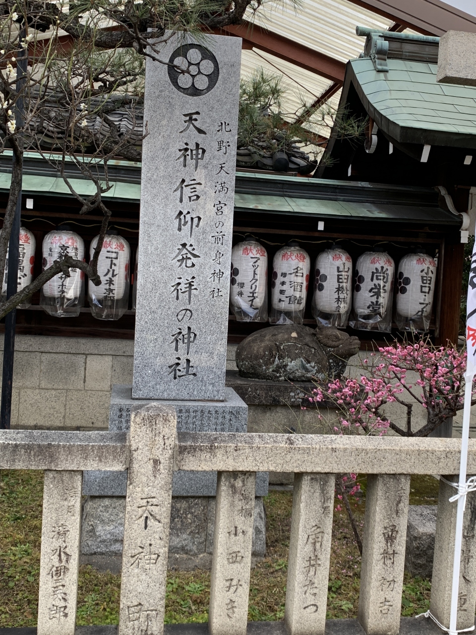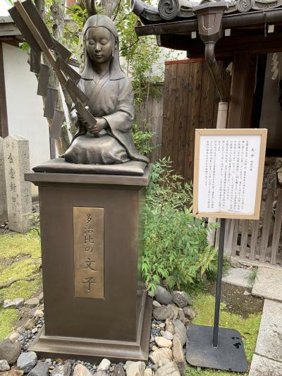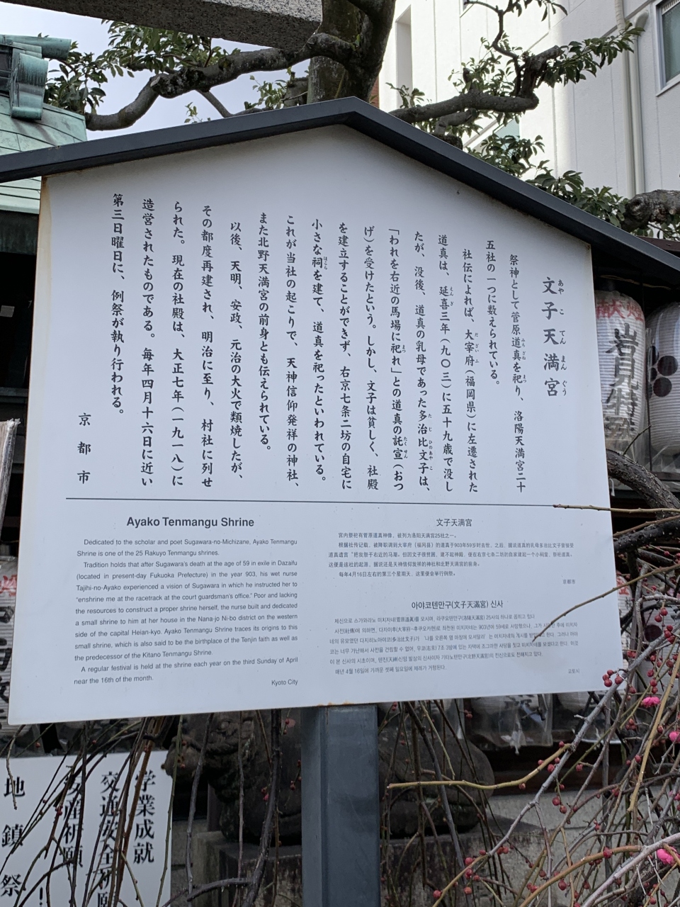 菅原道真が大宰府に左遷され、亡くなったあと、乳母だった多治比文子に北野の右近の現の地に祀ってもらいたいと宣託し、その後、文子は自分の庭に祠をつくり、道真を拝んだといわれています。そのことが北野天満宮が創建されるきっかけとなりました。菅原道真を天神として祀ったことは天神信仰の発祥の神社とよばれる由縁になりました。文子神社のなまえは「あやこ神社」で、あやこ、やあやなどが名前に入っている人の守り神としても信仰が続いているようです。
