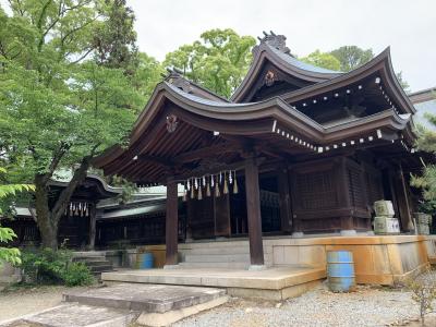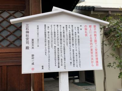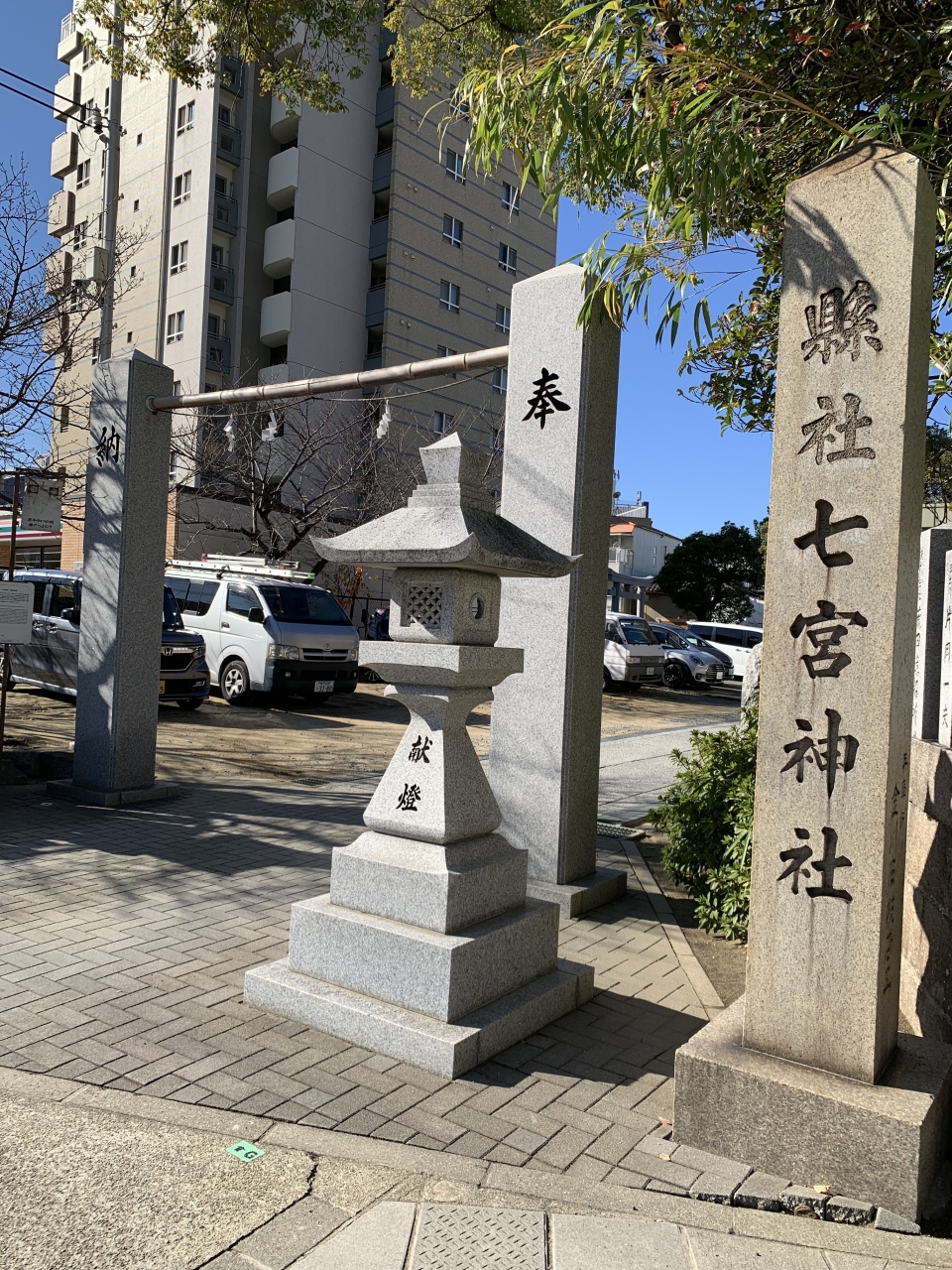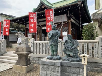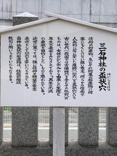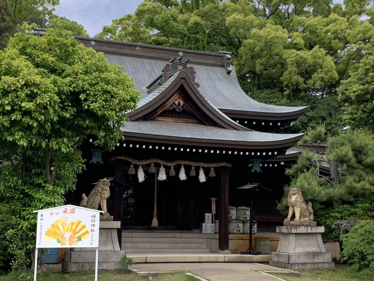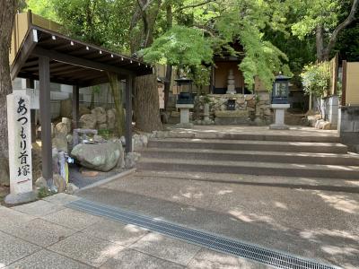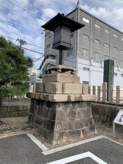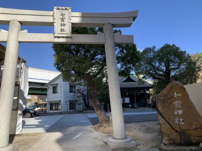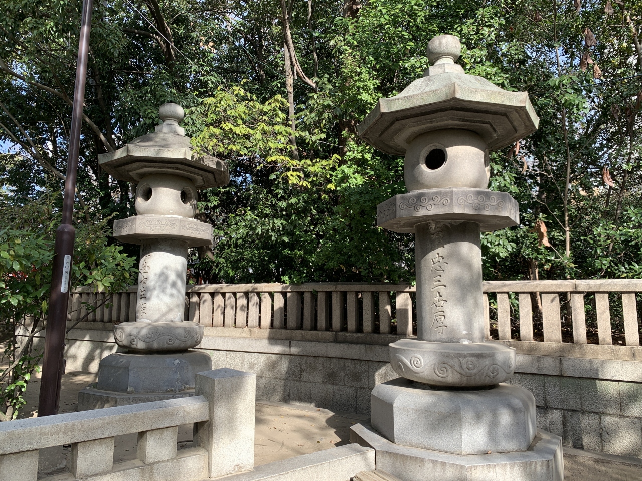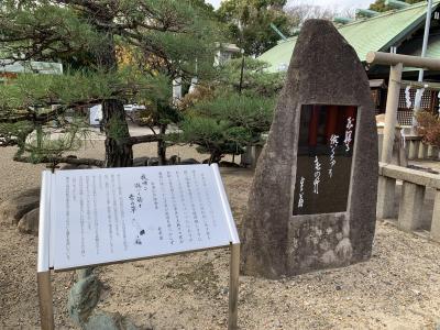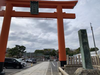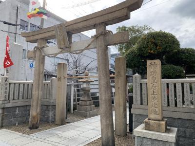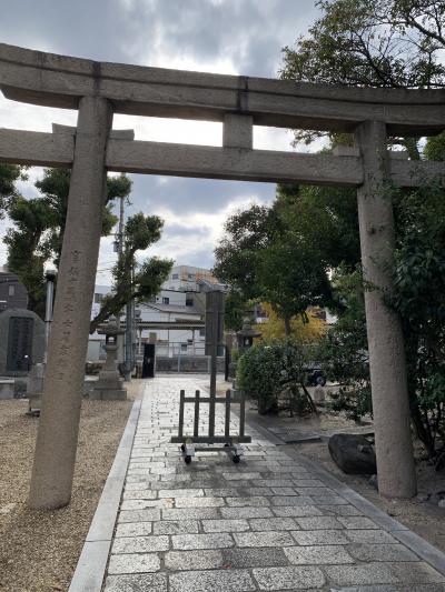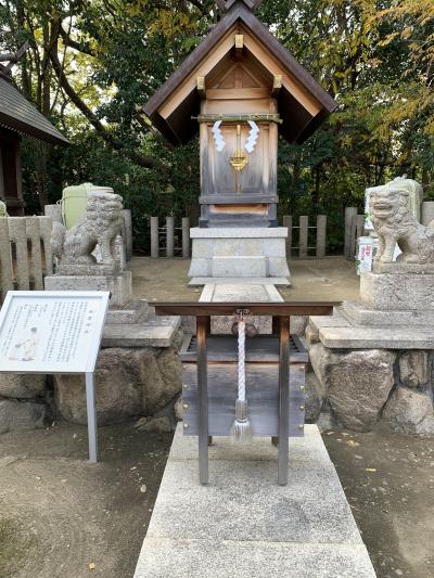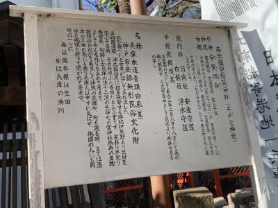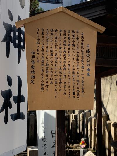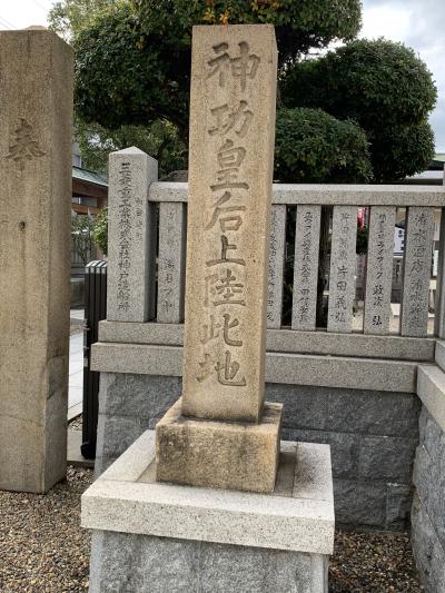 和田神社のすぐ近くにある小さな神社ですが、歴史のある由緒ある神社で、神功皇后との関わりの深い神社です。御祭神は神功皇后、天照大御神、素戔嗚大御神で、三韓遠征の際にこのあたりで船が進まなくなり、神功皇后が上陸して占いなどをして、この土地にとどまっていたという言い伝えがあります。神功皇后が三つの石を立てて占い、廣田神社、生田神社、長田神社、住吉神社の神を祀ったといわれ、また、三韓遠征に向かうときいに出産を遅らせるために三つの石を腰に巻き、帰国後に応仁天皇を無事に出産したという言い伝えがあります。