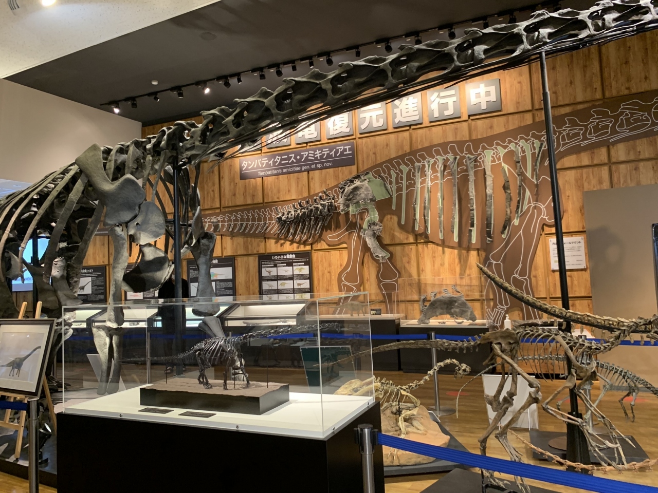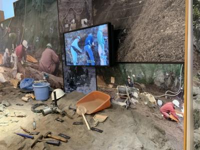 平成18年に丹波市で発見された恐竜の化石から本格的な化石の発掘調査が始まり、平成31年の調査では卵殻化石も発見され、世界有数の卵化石の産地であることがわかったそうです。また、丹波竜のほかにもティラノサウルス類の歯やカエルなどの化石も発見され、現在までに18000点ほどの化石が確認されているそうです。(パンフレットより)丹波竜やその他の篠山層から発見された恐竜の全身骨格の展示があります。また、恐竜の骨のパズルなど子供が触って楽しめるコーナーもあって、孫が夢中になっていました。館内のショップでは恐竜のおもちゃやお土産もあります。