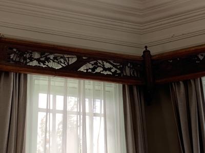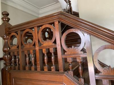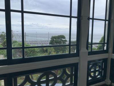 欄間のような模様にも洋や和のテーストがあり綺麗でした。階段の装飾もデザインも凝っていました。二階のバルコニーからは海も見渡せる景色が広がっています。