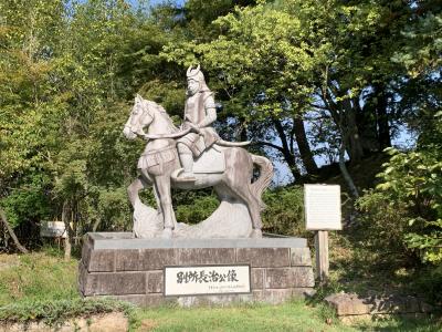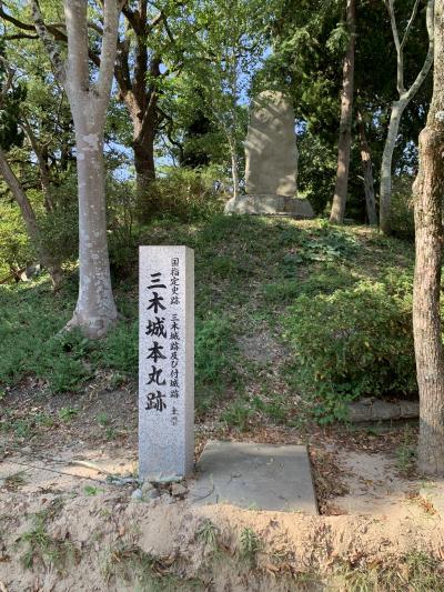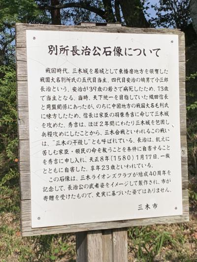 お城の跡には建物はありませんが、本丸には城主だった別所長治の像があります。三木城は播磨三大お城の一つで、別所則治が1492年に築城したといわれています。