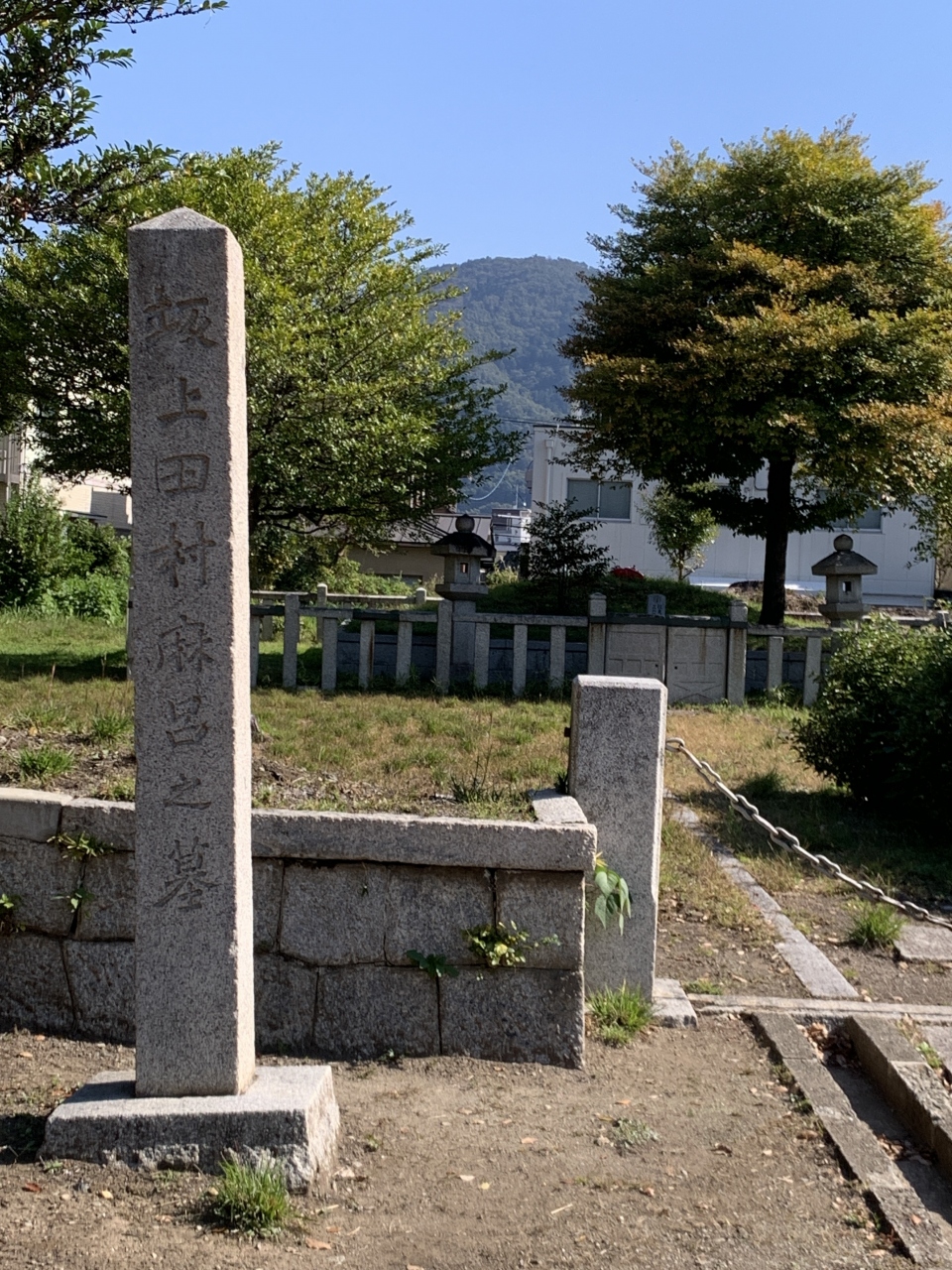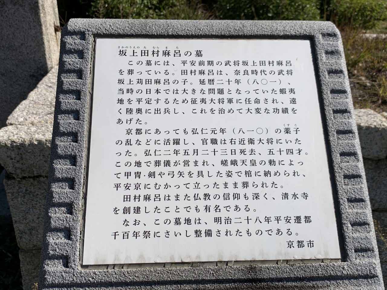 現在はここから西方の山麓にある西野山古墳が坂上田村麻呂のお墓として有力視されています。出土品は国宝にもなっています。