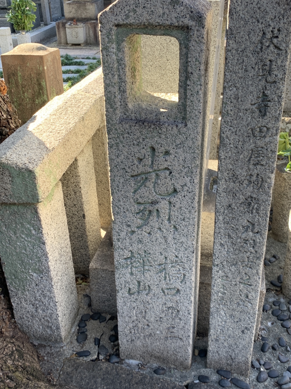 また、薩摩藩の家老平田靱負(ゆきえ)は木曽川治水工事の責任を取って自刃しており、そのお墓が境内にあります。その治水工事では多くの費用や日数、人々の犠牲があったそうですが、その分流堤は油島千本松締切堤(岐阜県)で今も水害から守っているそうです。また伏見義民の文殊九助ら7名の遺髪塔もあります。