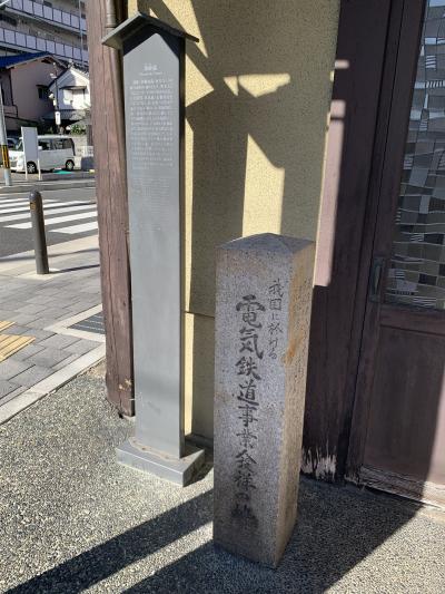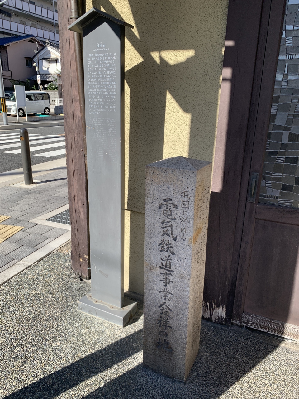 七條停車場電停から下油掛電停までの約6.7㎞の区間でした。当時の電力は琵琶湖疎水を使い、発電した電力を使っていたそうです。説明板と石碑はその下油掛の和菓子屋さんの角にあり、ちょうど交差点になったところにあります。交通量も多い場所です。- 旅行時期