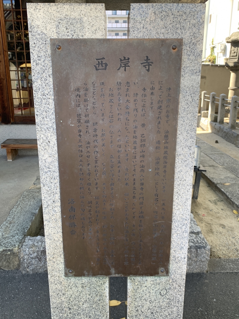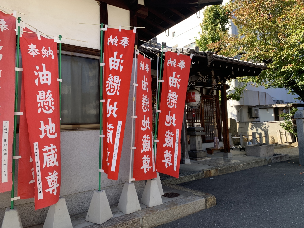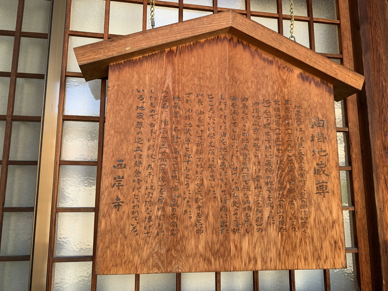 言い伝えによると、ある商人が油をこぼしてしまい、残りの油をお地蔵さんにかけたところ商売が繁盛したことから、信仰を集めるようになりました。地蔵堂に石造の地蔵があり、油をかけたためか黒く光っているそうです。地蔵堂を残して、鳥羽伏見の戦いで