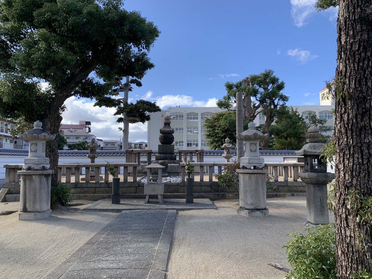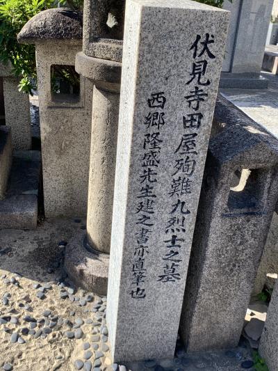 薩摩藩邸から近いこともあり、幕末には薩摩藩の密議も度々行われ、西郷隆盛や大久保利通などが使った部屋が残っているそうです。書やゆかりの品も残されているそうです。また寺田屋騒動で命を落とした9名の薩摩藩士のお墓もあり、墓石の横にある碑は西郷隆盛の筆によるものです。