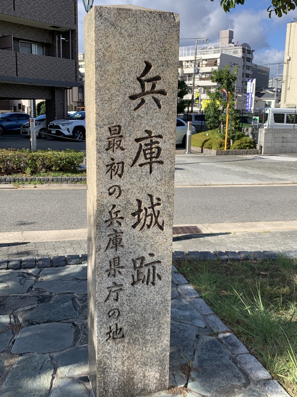 お城の遺構はほぼ無くなり、兵庫城跡 最初の兵庫県庁の地の石碑と説明板のみがあります。
