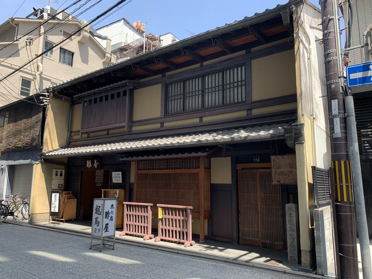 このあたりの地は、藩邸も多く、龍馬が京都で「酢屋」に身を寄せ、初代の酢屋嘉兵衛が龍馬を援助し、二階の一室で大政奉還に向けての準備をしていたそうです。海援隊京都本部もこちらに置いて、海援隊の志士や陸奥宗光らも行き来していたそうです。(パンフレットより)一階では木製の工芸品などのショップになっていました。