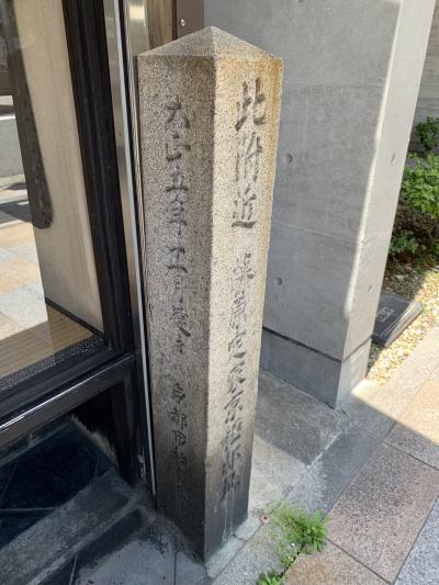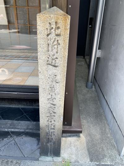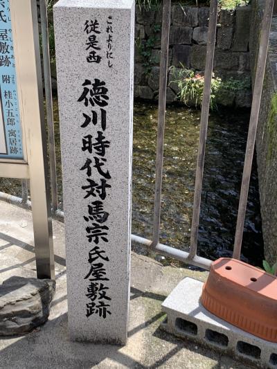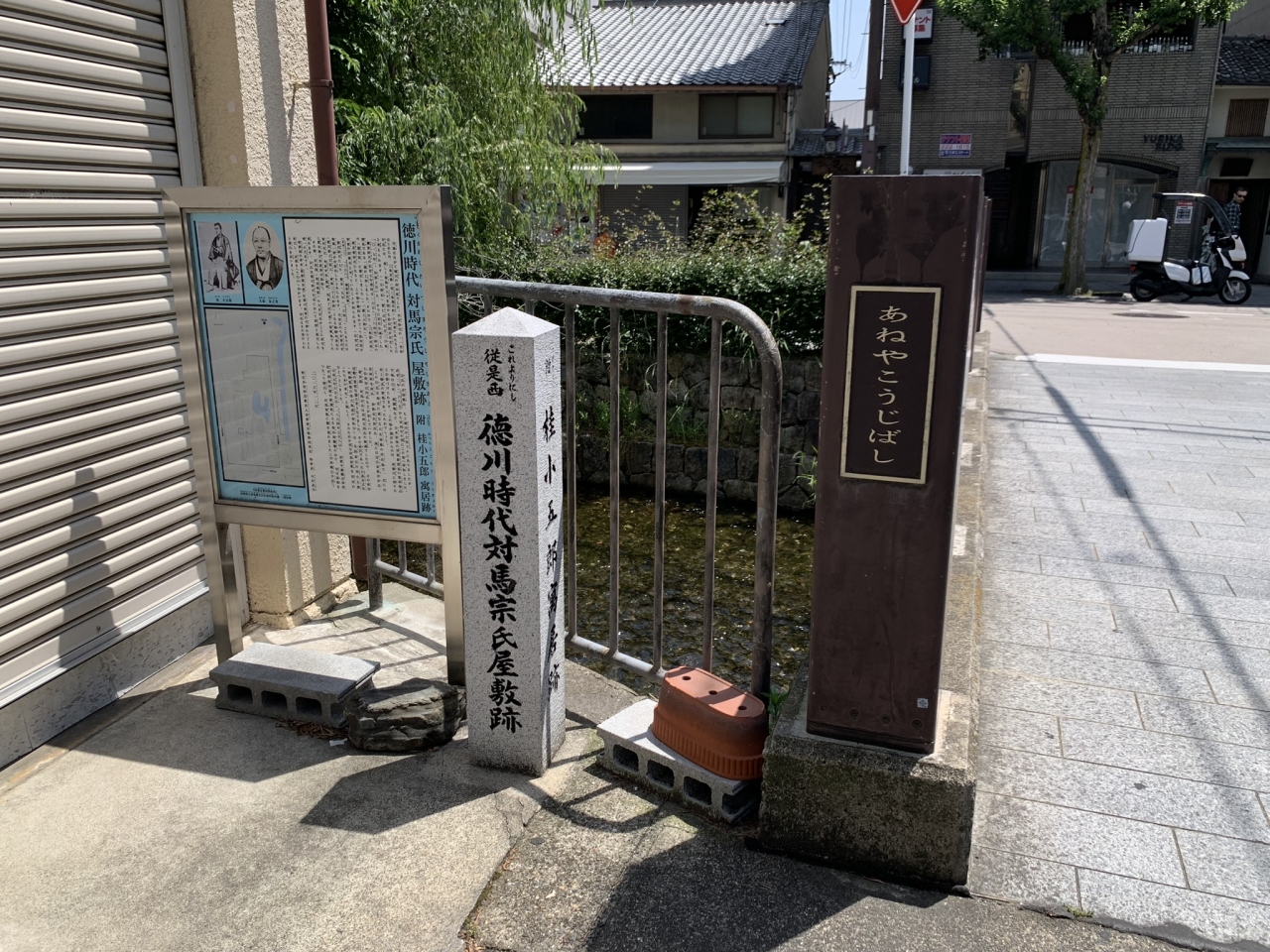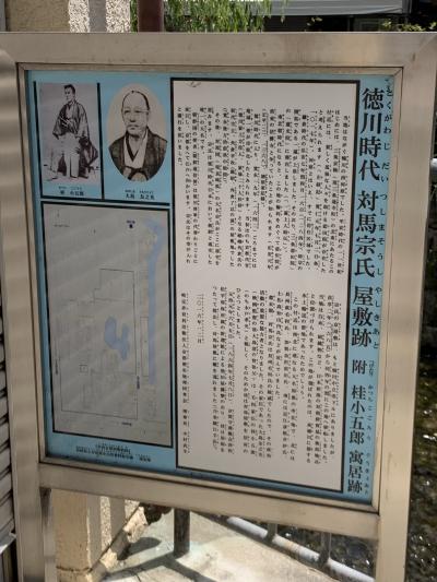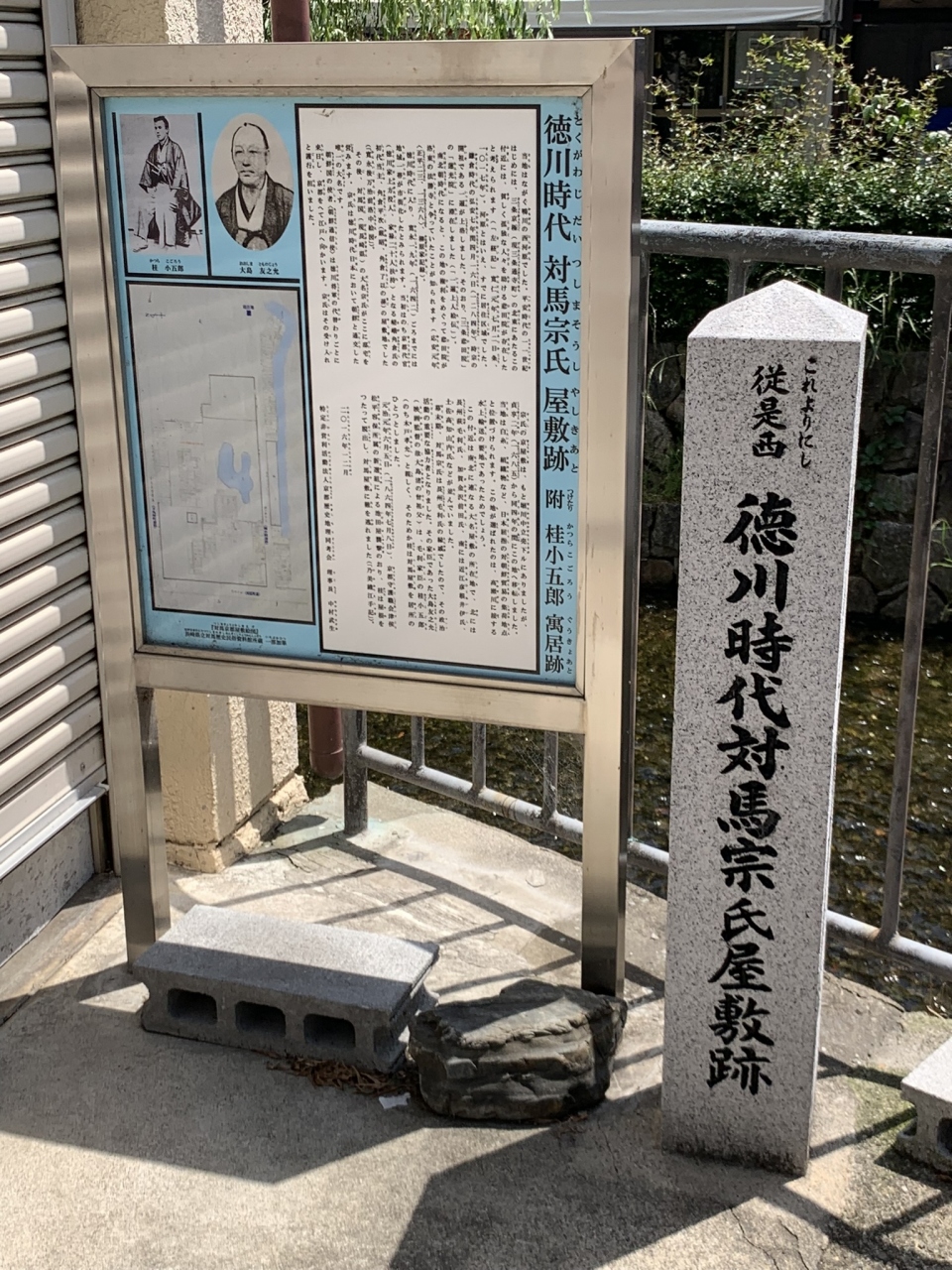 小さな橋のたもとにあります。この地に、江戸時代初期に対馬藩の屋敷が建てられています。また、桂小五郎が対馬藩士でもあり、外交官でもあった大島友之允と親交があったことから、桂小五郎がこちらも寓居にしていました。桂小五郎は池田屋事件の際に、この屋敷に逃げ込み難を逃れたといわれているそうです。