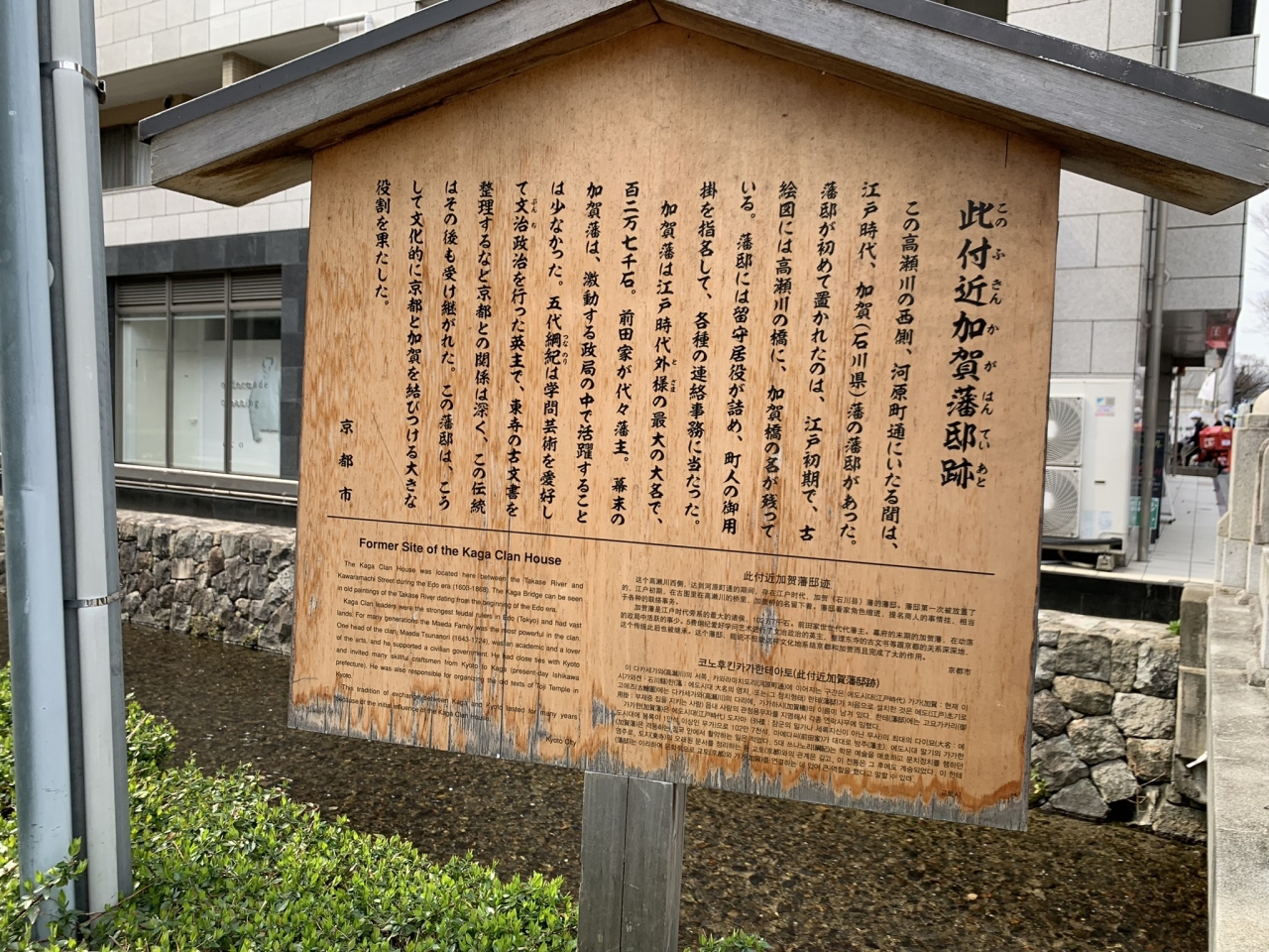 江戸初期には加賀藩邸は置かれていたようですが、高瀬川にかかる橋の名前に加賀橋があったそうです。今は説明の駒札が置かれています。加賀藩おいえば、外様大名の中でも100万石を超える大きな大名です。1788年に一度消失していますが、その後再建されています。駒札の説明板と共に、小さな石碑があります。