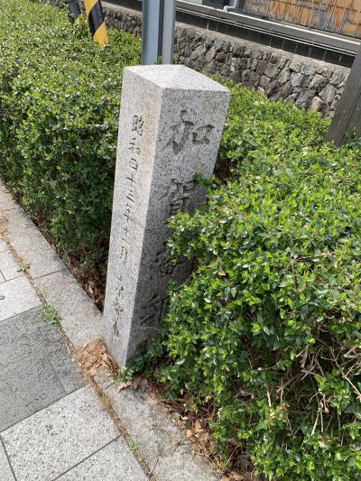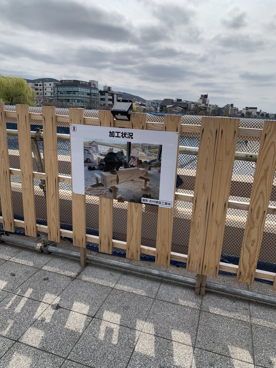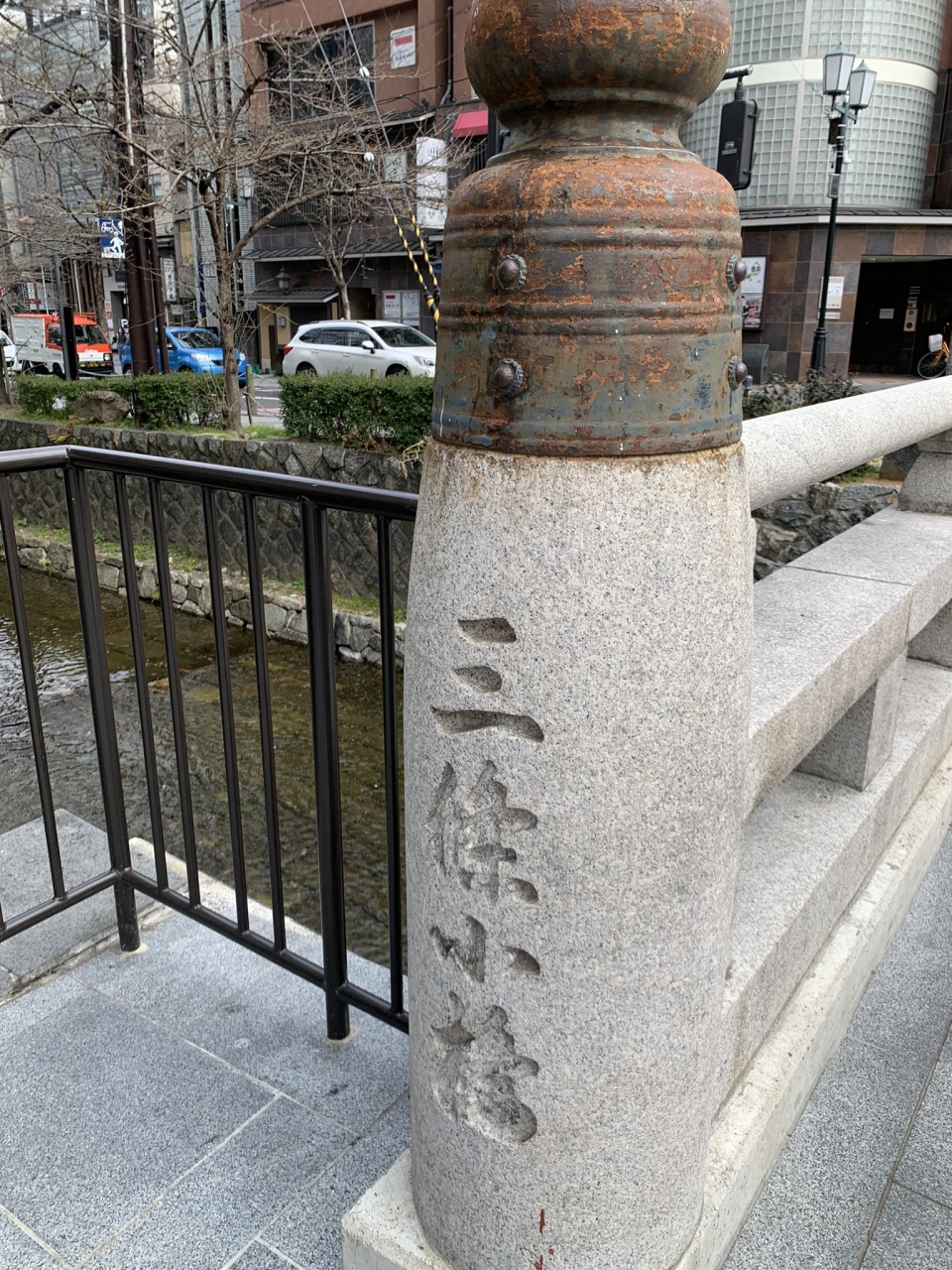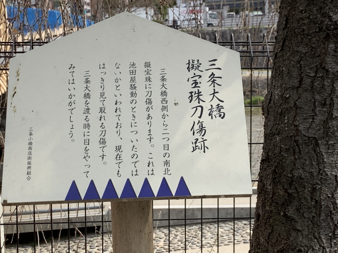 三条大橋の歴史は古く、室町時代にはすでに橋がかけられていたそうですが、 豊臣秀吉の時代に石柱を用いた橋に大改修されたそうです。その石柱には天正という文字も刻まれています。江戸時代や明治、大正時代にも橋の改修は行われています。訪れたときもまさに改修の時でした。東海道五十三次の西の起点でもあります。高札場も設けられた場所です。石柱と高札場については駒札で説明がされていました。