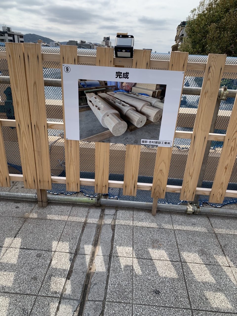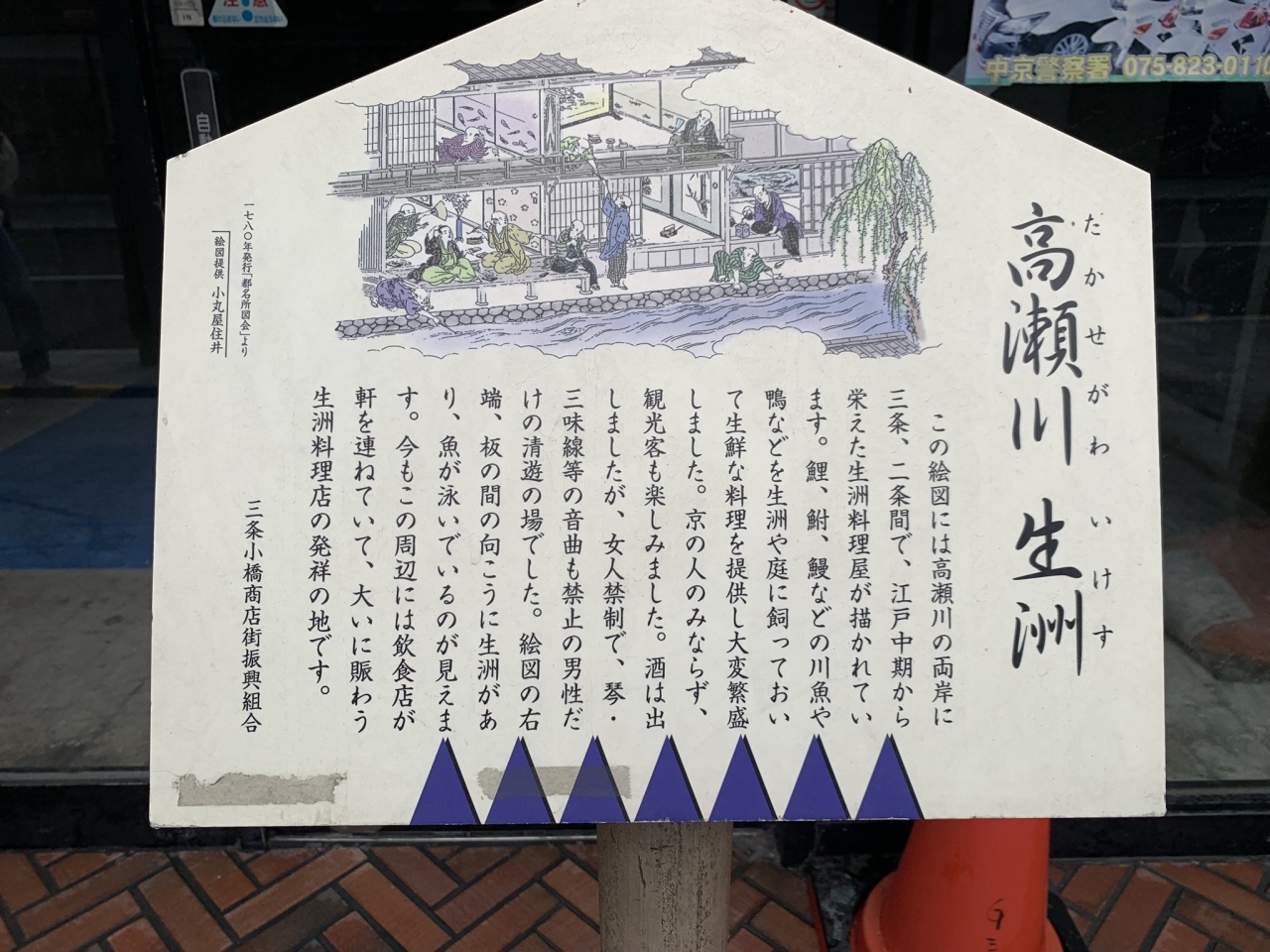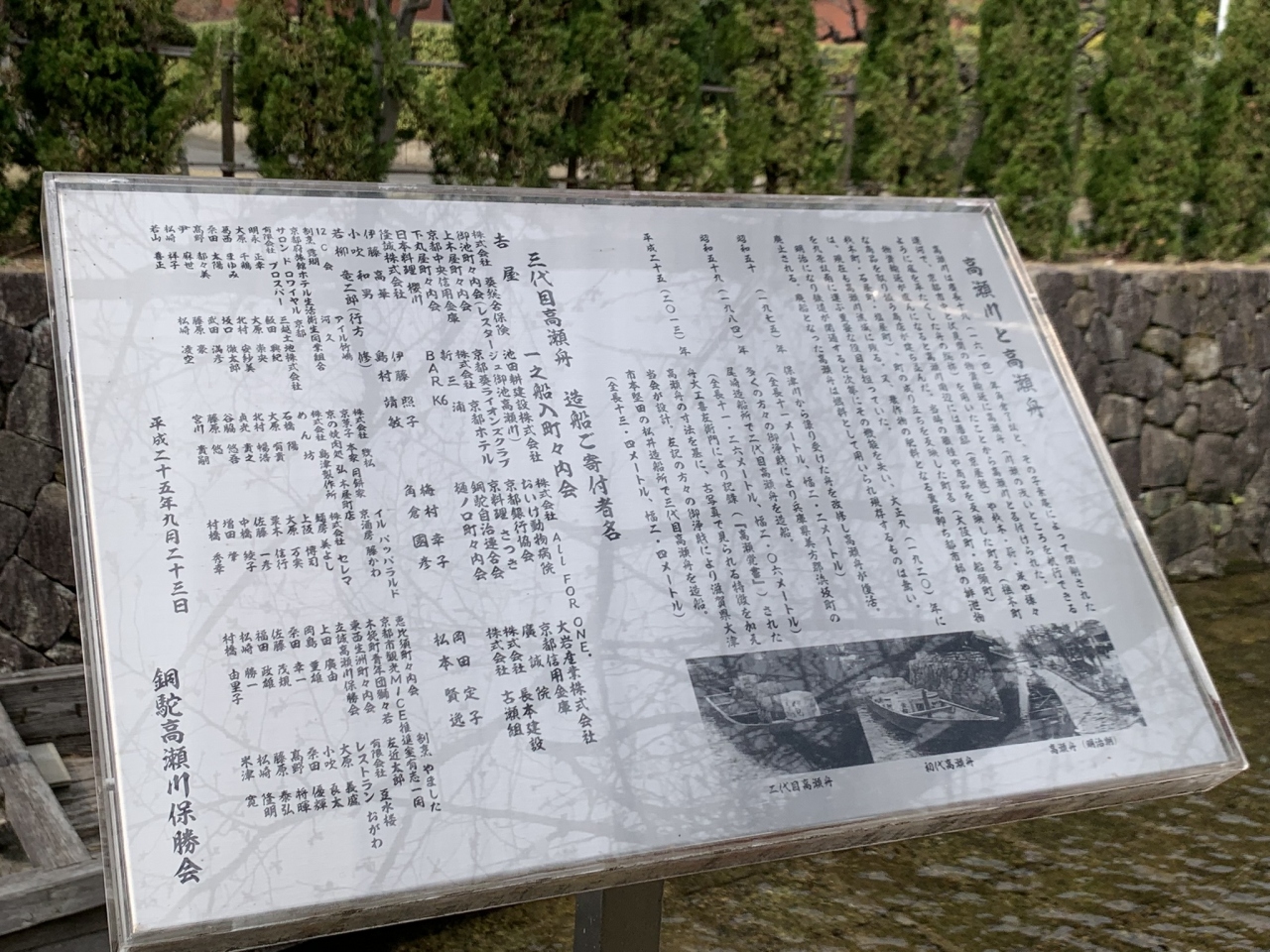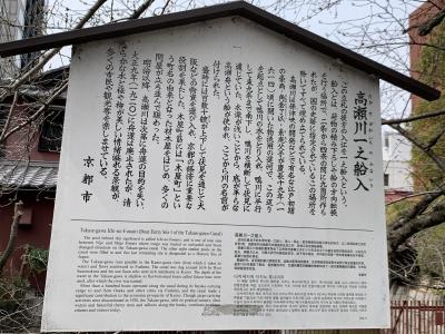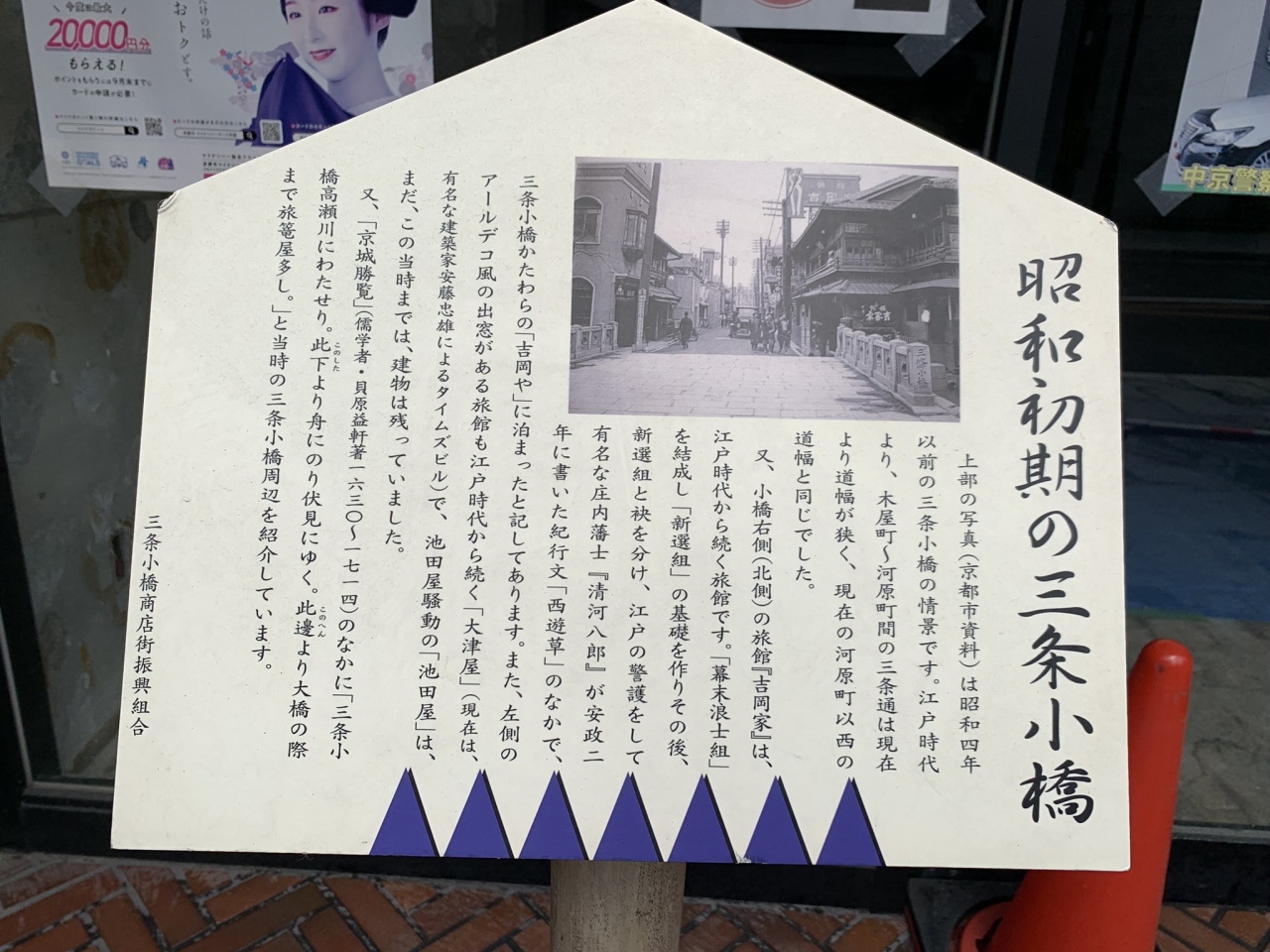 三条大橋の歴史は古く、室町時代にはすでに橋がかけられていたそうですが、 豊臣秀吉の時代に石柱を用いた橋に大改修されたそうです。その石柱には天正という文字も刻まれています。江戸時代や明治、大正時代にも橋の改修は行われています。訪れたときもまさに改修の時でした。東海道五十三次の西の起点でもあります。高札場も設けられた場所です。石柱と高札場については駒札で説明がされていました。