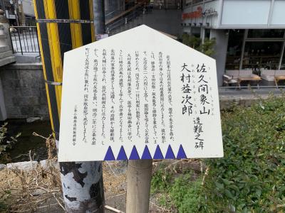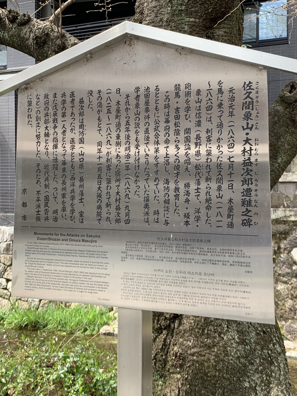 佐久間象山と大村益次郎の遭難の地の碑が並んで立っています。すぐそばには行けませんが、高瀬川をはさんで観ることができます。佐久間象山は松代藩士で開国論を唱え、公武合体も進めていた人物です。吉田松陰や勝海舟、坂本龍馬にも影響を与えました。1864年に海防について、幕府の要請で京都に滞在中のこのあたりの路上で攘夷派に襲われ命を落としました。大村益次郎も1869年このあたりの旅館で襲われ、その怪我がもとで命を落とします。大村益次郎は近代兵制の基礎を造った人物で、戊辰戦争でも功績をあげ、のちに兵部大輔になりましたが、急速な近代化の兵制改革に不満を持った旧士族による事件とみられています。幕末の動乱から明治にかけて、大切な人材が次々と失われたことがわかります。