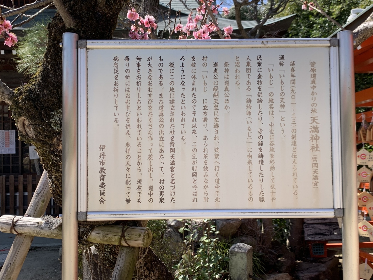 鐘や鋳物などを製作する鋳物師の職人集団もこのあたりに多く居住し、「いもじ千軒」と呼ばれた時期もありました。鋳物師は地名としても残っているそうです。説明板にもありますが、菅原道真が立ち寄った際には村人たちがお茶で接待し、大宰府に向かうときには大きなおむすびを用意し、道中の無事を祈ったといわれています。お祭りでは今でもおむすびが用意されるそうです。遠い地に配流となった菅原道真がこの地で人々の素朴で優しい心づくしで癒されたことが偲ばれました。- 旅行時期