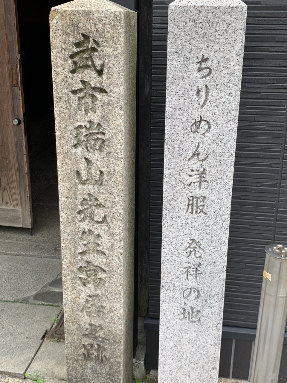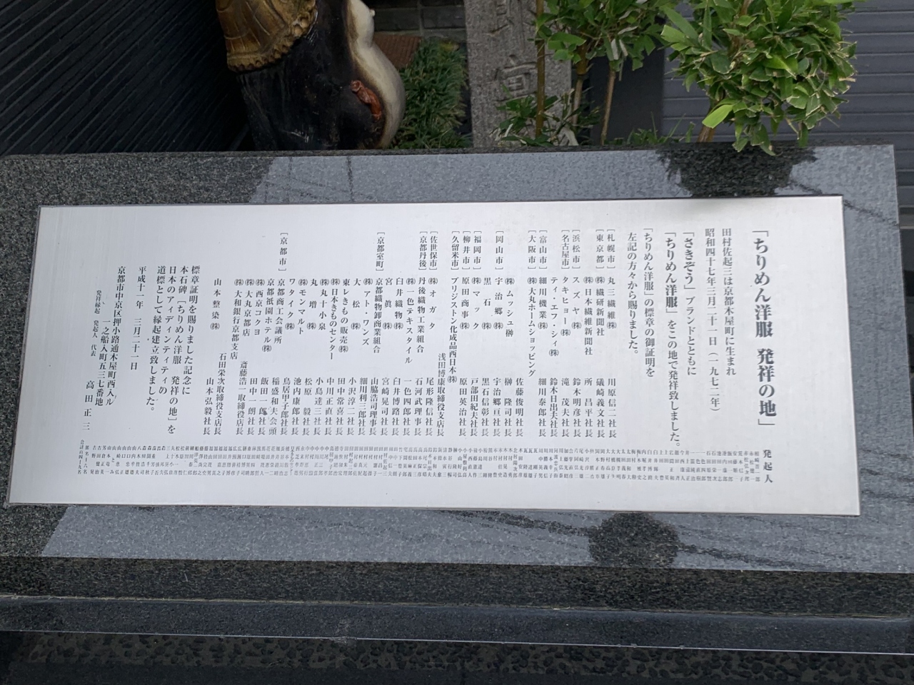 田中佐起三は1972年に株式会社 SAKIZOを創業し、ちりめんの素材を使ったワンピースやスカートなどを創作しています。少し先のほうには、「さきぞう発祥の地」の碑もあります。- 旅行時期