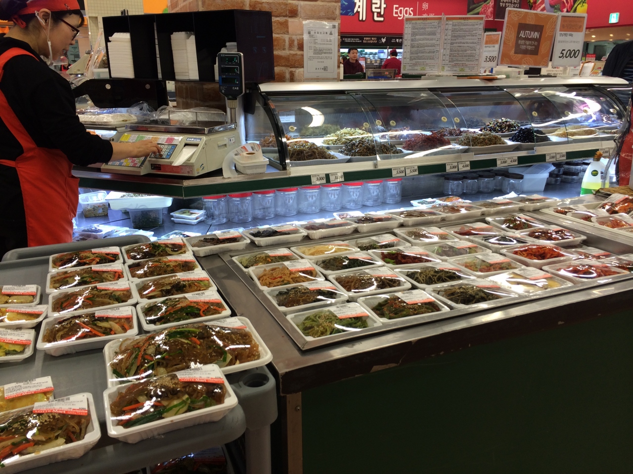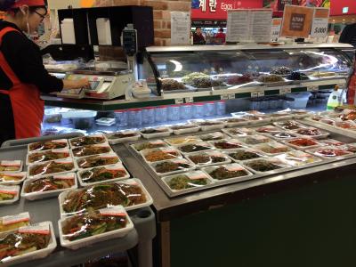 お惣菜も種類多く売っていて、色んな種類を買ってみました。3つで日本円1000円くらいで、ナムルや小魚、天ぷらなどなど。一番気になる匂いはスタッフの方が手慣れた包装で何重にもラップやビニールで。おかげで、その夜は韓国料理を自宅で家族でいただけました。ネギキムチのような、さらに匂いの心配になるものも、その頑丈な包装で全く問題なし。次回も帰国前に是非に利用しようと思いました。- 旅行時期