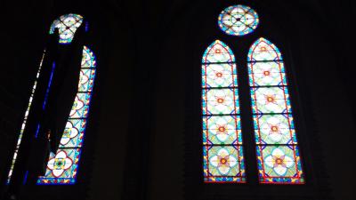 - 聖堂内祭壇やアーチ形の廊下、窓、ステンドグラス。教会外にもマリア像など。