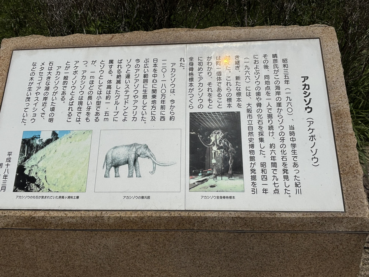 昭和35年に中学生がゾウの牙を発見し、その後発掘が続き、多数の化石が発見され、「アカシゾウ、またはアケボノゾウと呼ばれ、200万年前~60年前に日本列島に住んでいたゾウの一種でした。