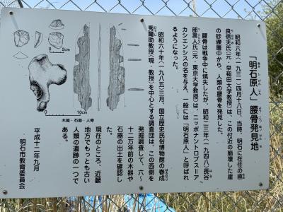 西八木海岸で、昭和6年に直良信夫が発見した人骨がのちに「明石原人」と呼ばれ、原人段階の古い人類ともいわれてきましたが、現在でもいつの時代の人骨なのか論争が続ているそうです。