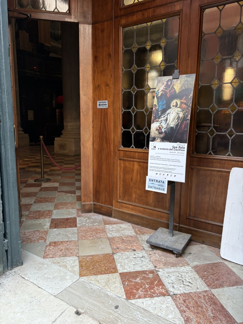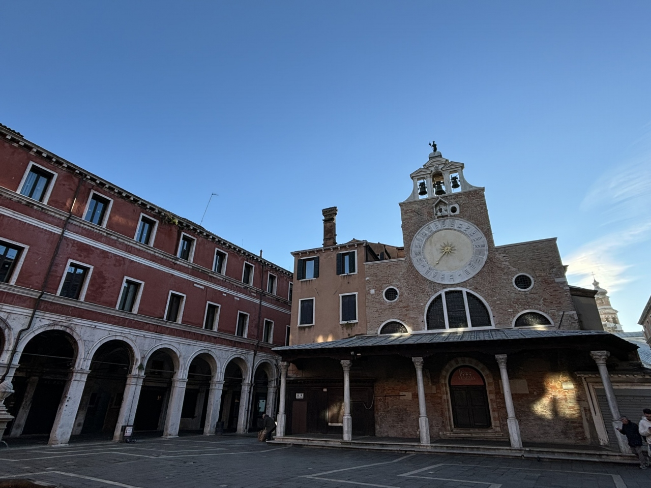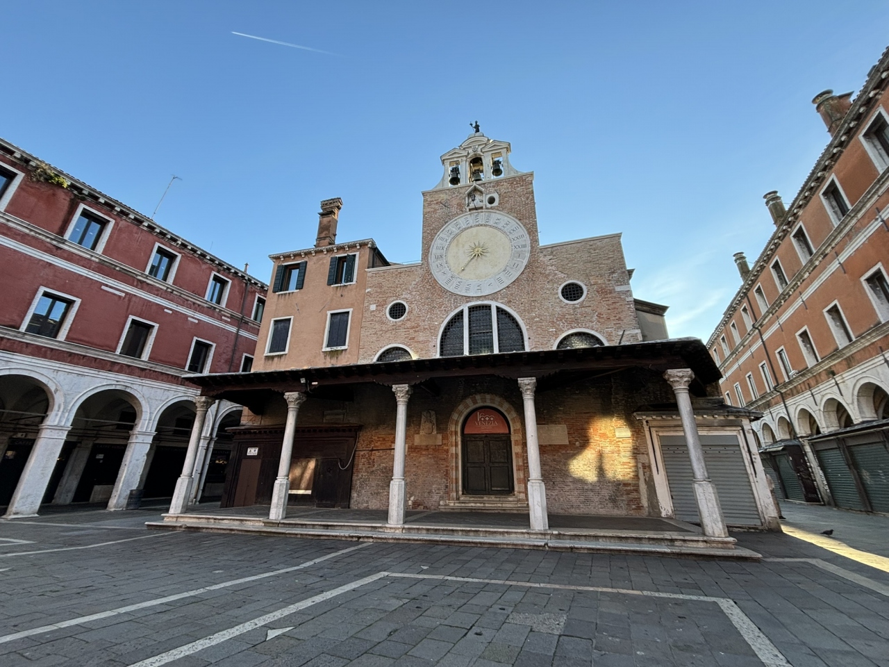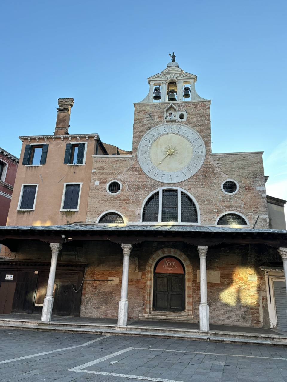 リアルト橋の近くにある教会です。教会ファサード上の方に、大きな時計があり、数字が24あります。その上には鐘も見えました。