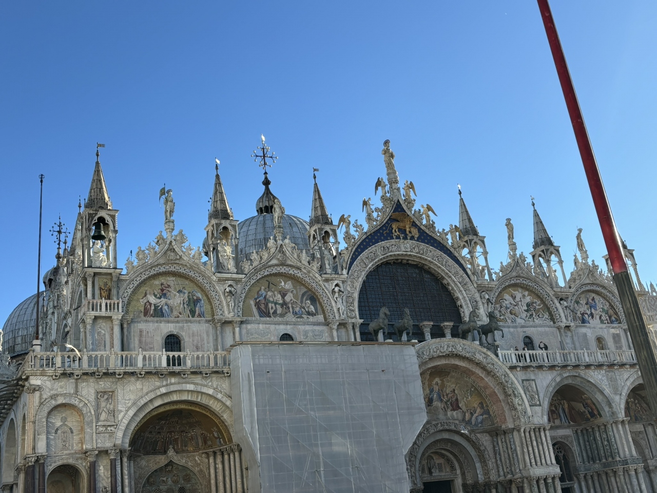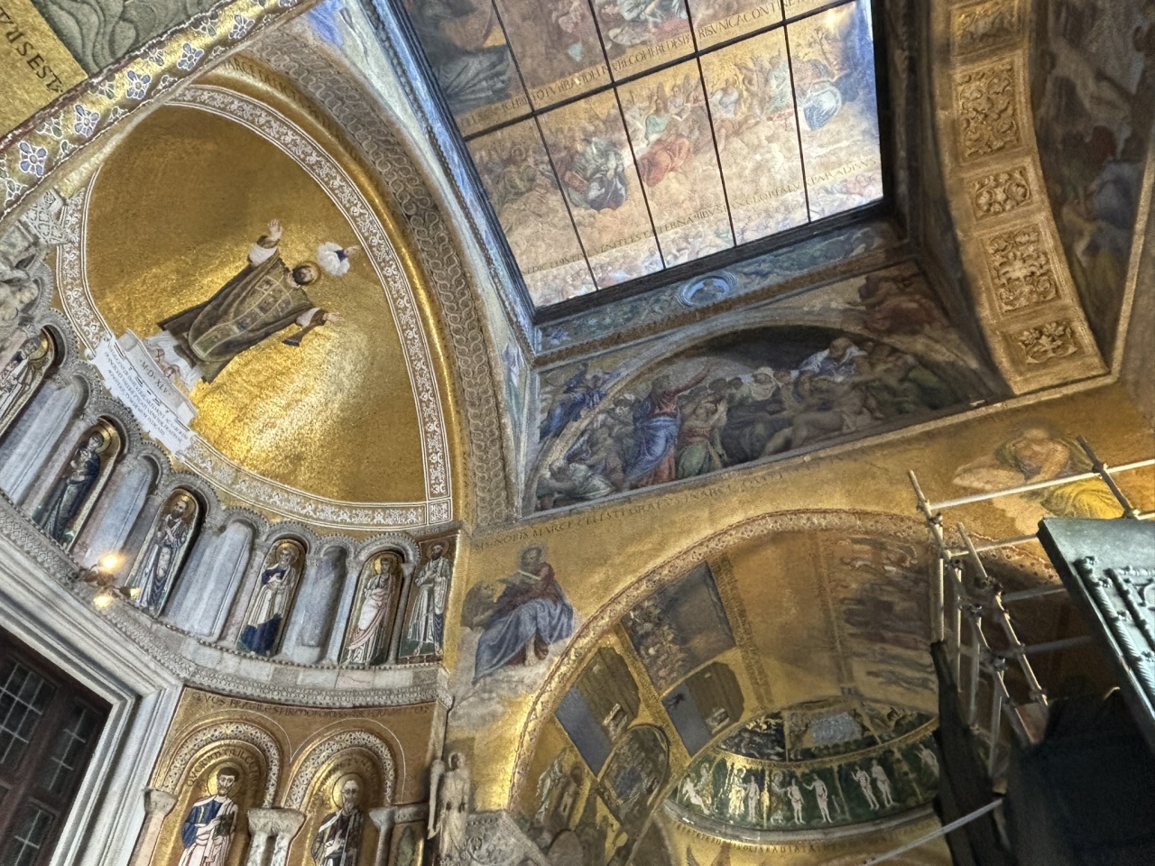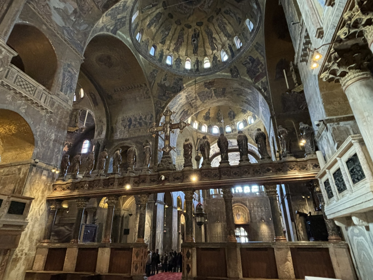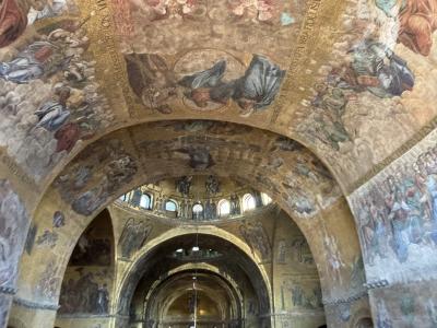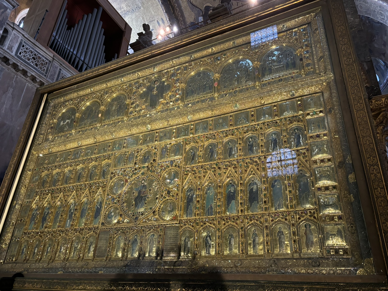 入って、壁、天井などに拡がるモザイク画に圧倒されます。奥のほうに進むと、祭壇があり、その裏側にはパラ・ドーロと呼ばれる聖マルコやキリストの生涯が描かれたものがあります。金色がまぶしく、真珠や宝石がちりばめられています。