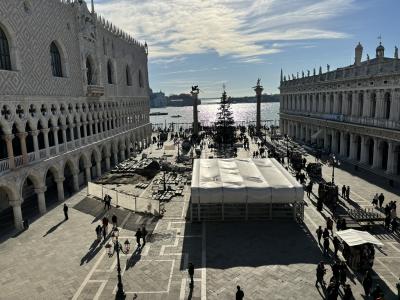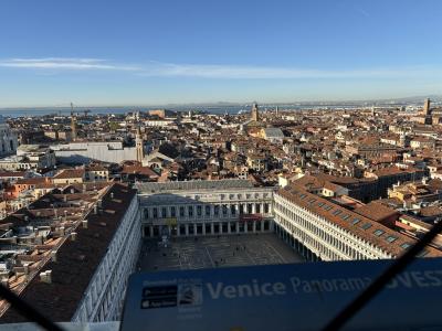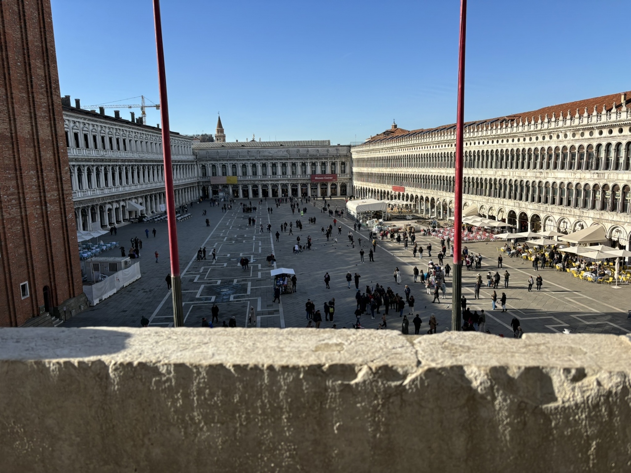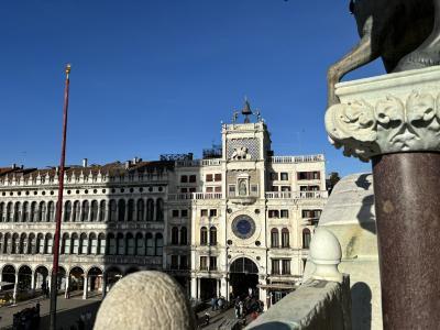 テラスからの眺めは最高で、下のサン・マルコ広場を見下ろせ、また近くにある時計塔も良く見えます。時計塔ではちょうど、鐘が鳴る時で、頂上にいたムーア人の人形が鐘を打ち鳴らす様子も見えました。